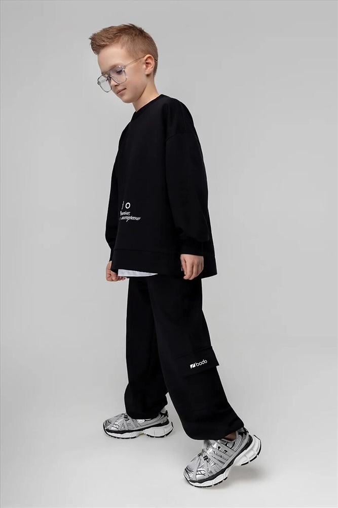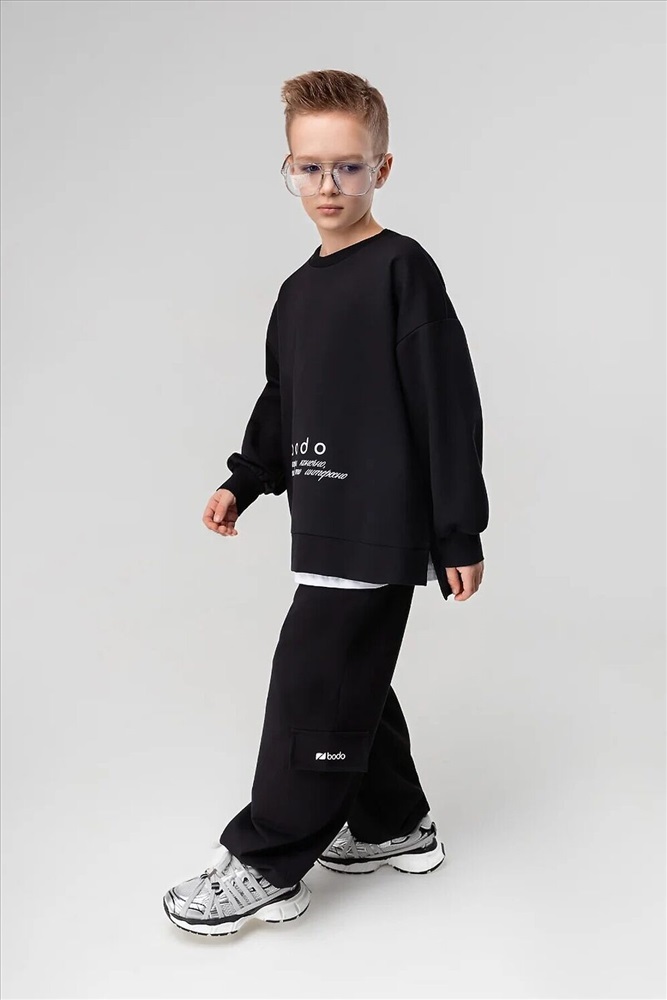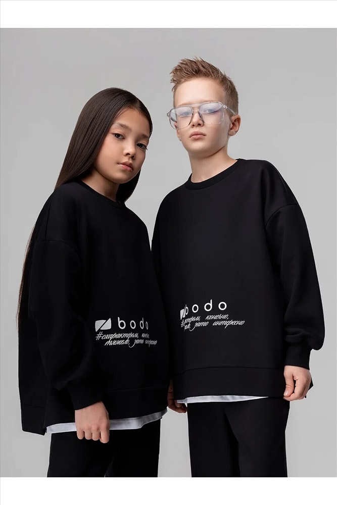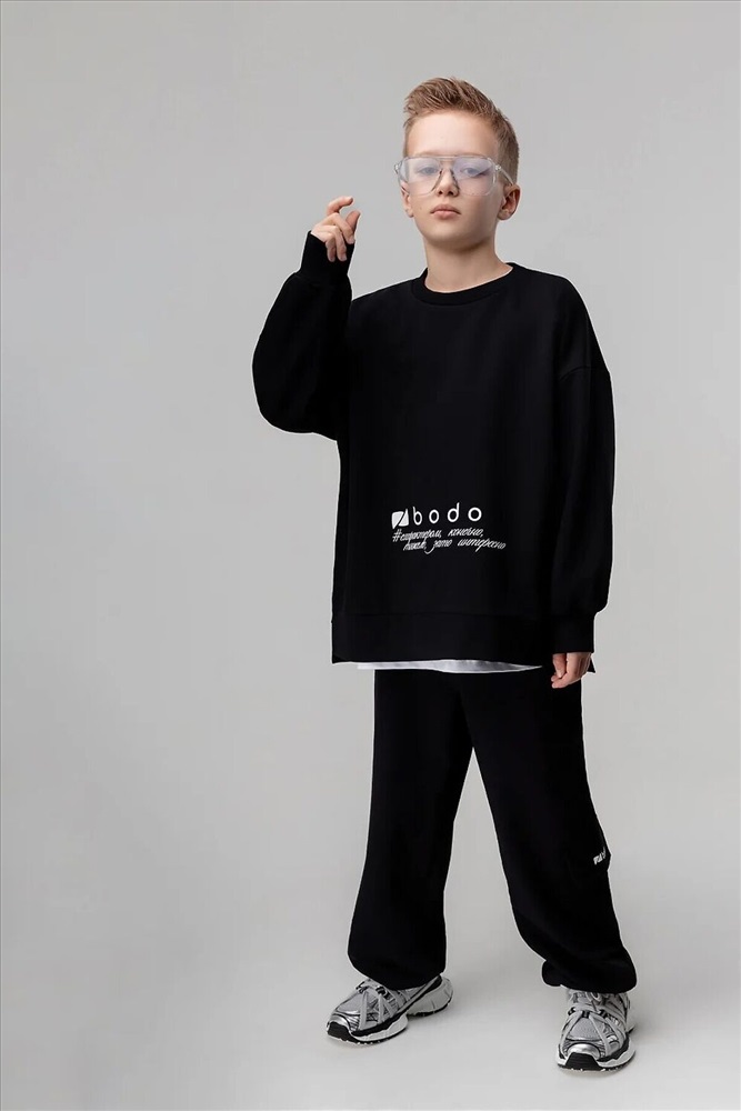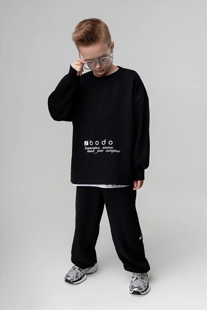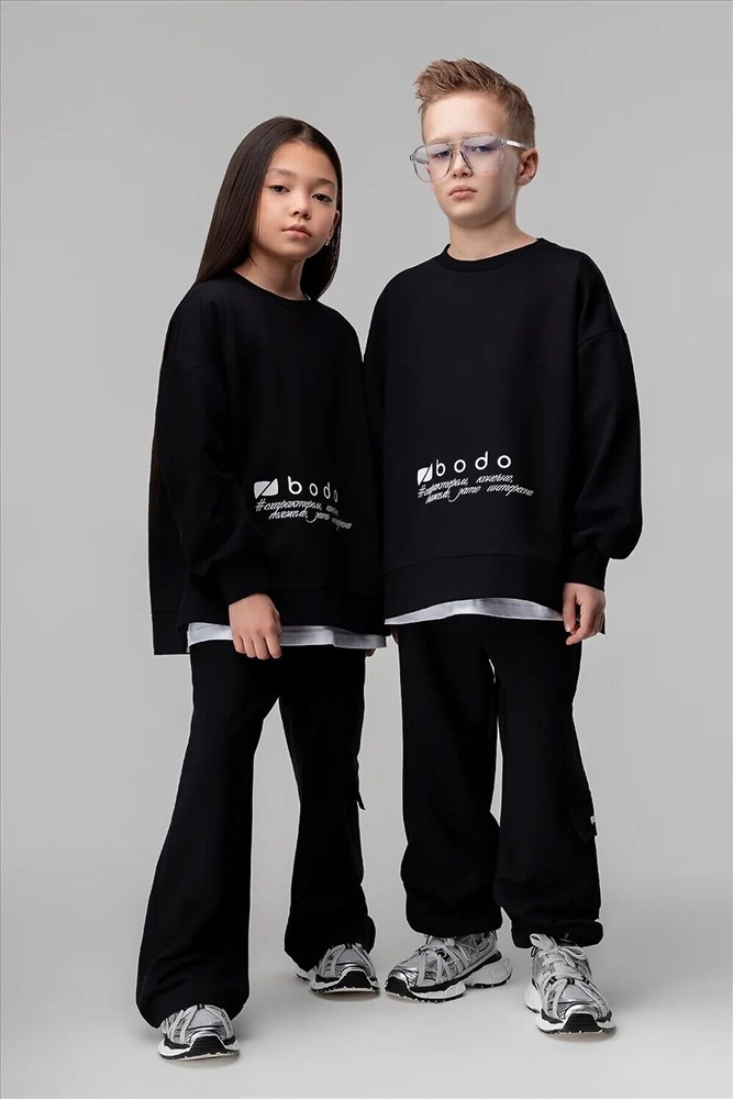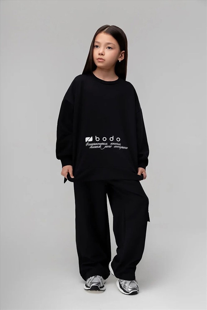 ID товара: 1241925 Состав: 92% Хлопок, 8% Лайкра Сезон: Демисезон Длина: Полная Фасон: Свободный крой Рукав: Длинный Крой брючин: Прямой Рисунок: Надпись Тип карманов: В шве Основная ткань: Хлопок Стиль: Спортивный Страна бренда: Россия Страна производства: Россия Костюм: свитшот и брюки. Прямая, свободная толстовка с разрезами по бокам. Длинные рукава на манжете. Длина изделия полочки короче длины изделия спинки. Округлая горловина. На полочке принт "бодо с характером". Свободные, прямые брюки на поясе с внутренней резинкой. Брюки с накладными карманами с клапанами по боковым швам, по низу брюк имеется дополнительная резинка с фиксатором для затяжки. Комментарии к товару