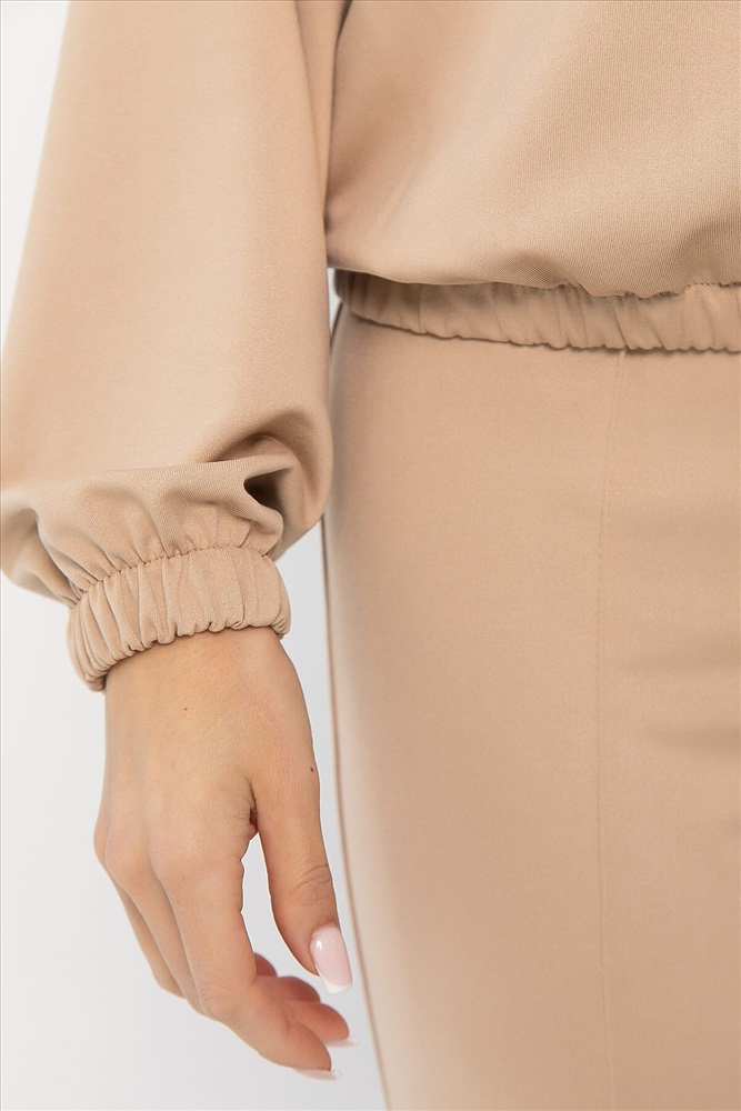 Состав : 65% полиэстер, 30% хлопок, 5% эластан Материал : футер 2-х нитка Цвет : Бежевый Принт : отсутствует Силуэт : свободный Карманы : Отсутствуют Резинка в поясе : Да Вид застежки : без застёжки Декоративные элементы : бант на спине со шнуром из страз. На груди декоративный элемент из шнура из страз.