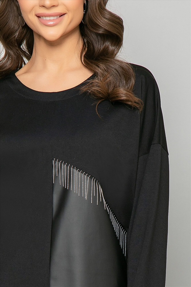 Артикул: К5095. Ткань: трикотаж, экокожа. Состав: 95% п/э, 5% эластан. Цвет: чёрный. Вид застежки: без застёжки. Силуэт: свободный. Карманы: в боковых швах брюк. Тип горловины: округлый. Длина изделия свитшот по спинке: 46/ 69 см, 48/ 70см, 50/ 71 см, 52/ 72 см, 54/ 73 см, 56/ 74 см. Длина брюк с учётом резинки: 46-56/ 107 см. Рост модели: 175 см.