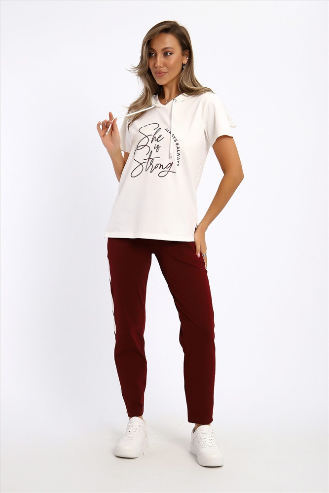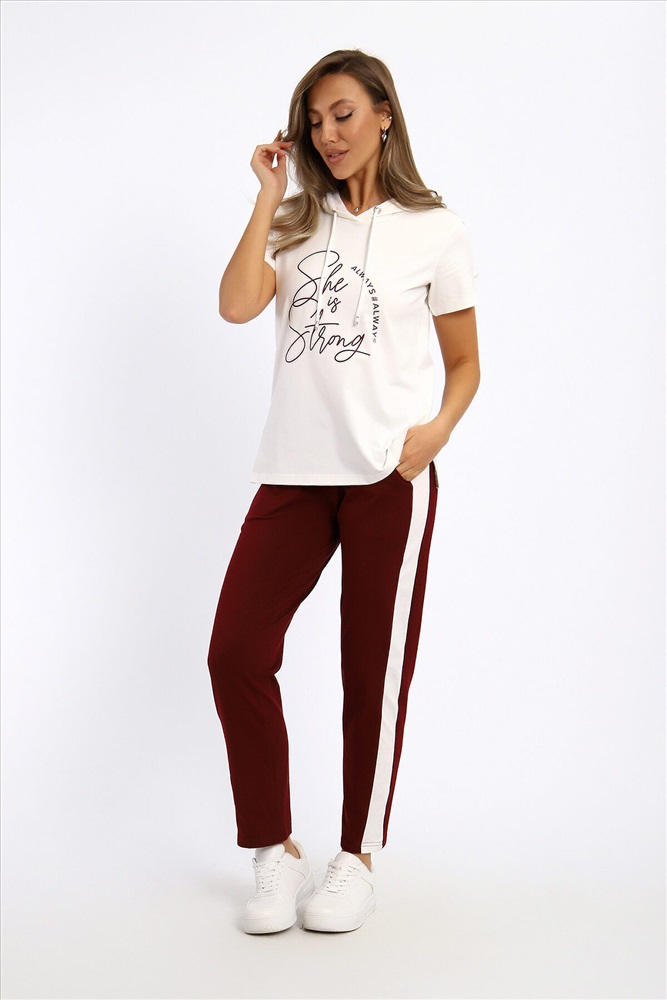 ID товара: 1210920 Состав: 92% Хлопок, 8% Лайкра Сезон: Демисезон Длина: Полная Фасон: Полуприлегающий Рукав: короткие Крой брючин: Зауженный Рисунок: Надпись Тип карманов: С отрезным бочком Декоративные элементы: Принт Основная ткань: Хлопок Стиль: Спортивный Вид ткани: Кулирка с лайкрой Страна бренда: Россия Страна производства: Россия Удобный, женственный трикотажный костюм со спортивной ноткой подарит вам чувство комфорта и позволит выглядеть сногсшибательно в любой ситуации! Костюм прекрасно подойдет для занятий спортом, пробежек или прогулок! Кофта белого цвета, с надписью латинскими буквами в цвет брюк, имеет капюшон, способный защитить волосы от солнечных лучей, ветра или дождя. Объем капюшона регулирует изящный шнурок. На брюках имеются лампасы белого цвета, гармонирующие с цветом кофты. Комментарии к товару