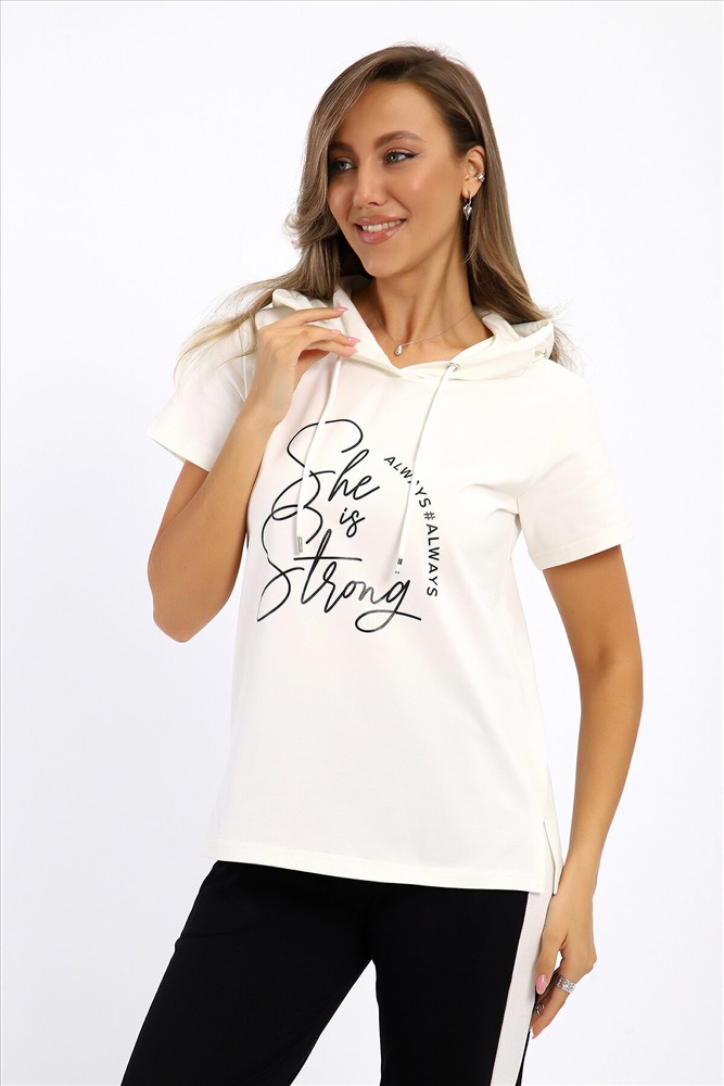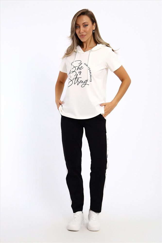 Удобный, женственный трикотажный костюм со спортивной ноткой подарит вам чувство комфорта и позволит выглядеть сногсшибательно в любой ситуации! Костюм прекрасно подойдет для занятий спортом, пробежек или прогулок! Кофта белого цвета, с надписью латинскими буквами в цвет брюк, имеет капюшон, способный защитить волосы от солнечных лучей, ветра или дождя. Объем капюшона регулирует изящный шнурок. На брюках имеются лампасы белого цвета, гармонирующие с цветом кофты.