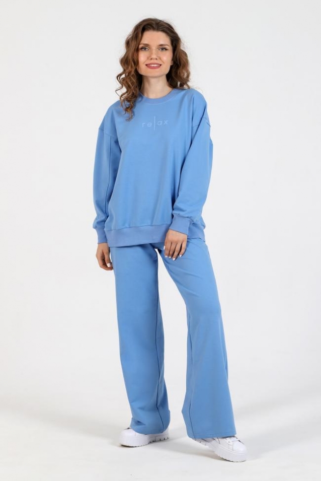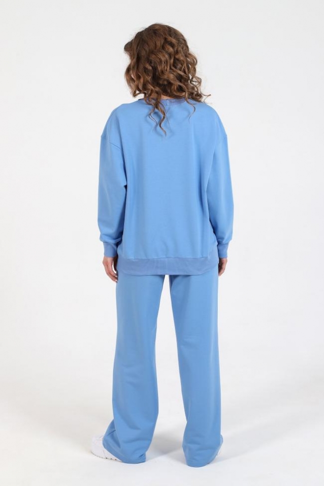 Костюм из гладкокрашеного трикотажного полотна «футер-двунитка», состоящий из джемпера и брюк. Джемпер - прямого силуэта, с длинными втачными рукавами, горловиной овальной формы, обработанной втачной планкой, притачным поясом и принтом на полочке, выполненным методом шелкографии. Манжеты рукавов, планка горловины и полупояса по низу изделия выполнены из эластичного полотна «рибана» в тон основному материалу, боковые швы смещены в сторону переда. Брюки – длинные слегка расширенные книзу, на притачном поясе с эластичной тесьмой внутри и карманами в боковых швах. Комментарии к товару