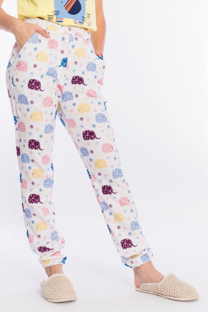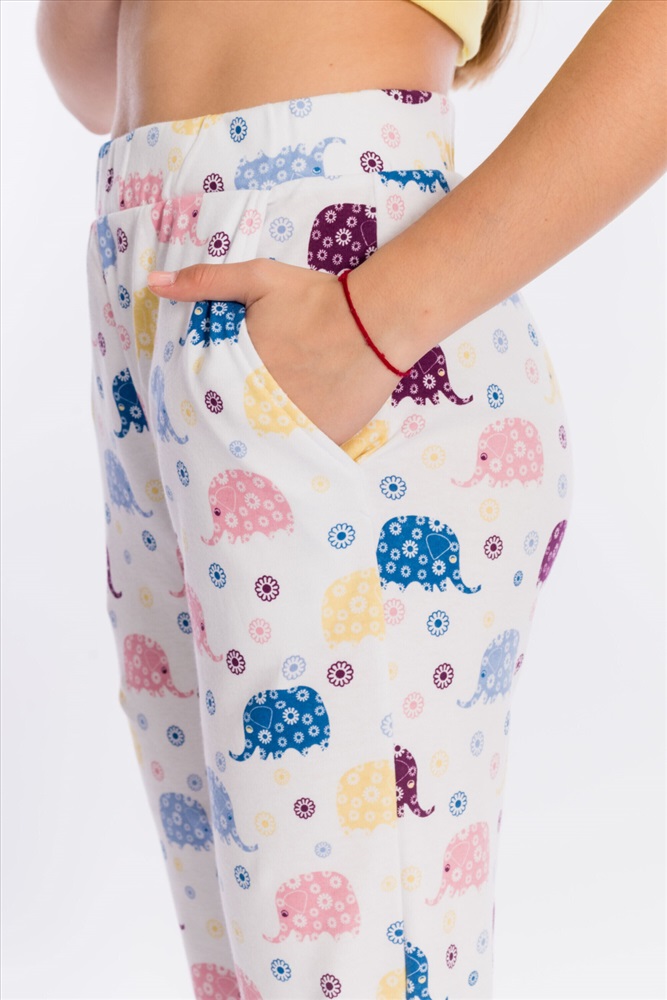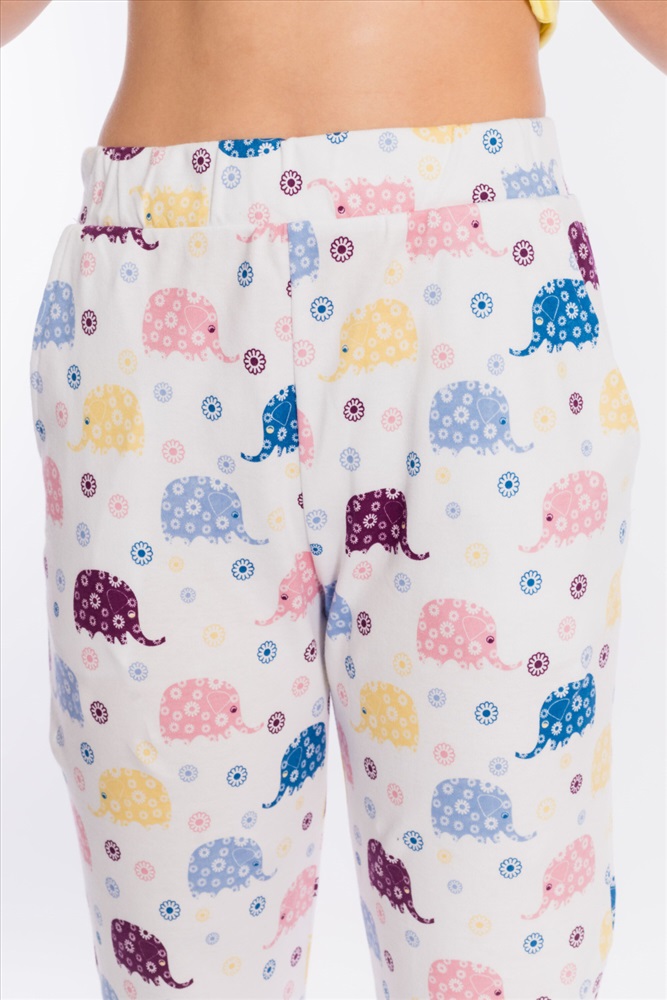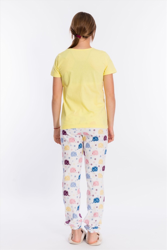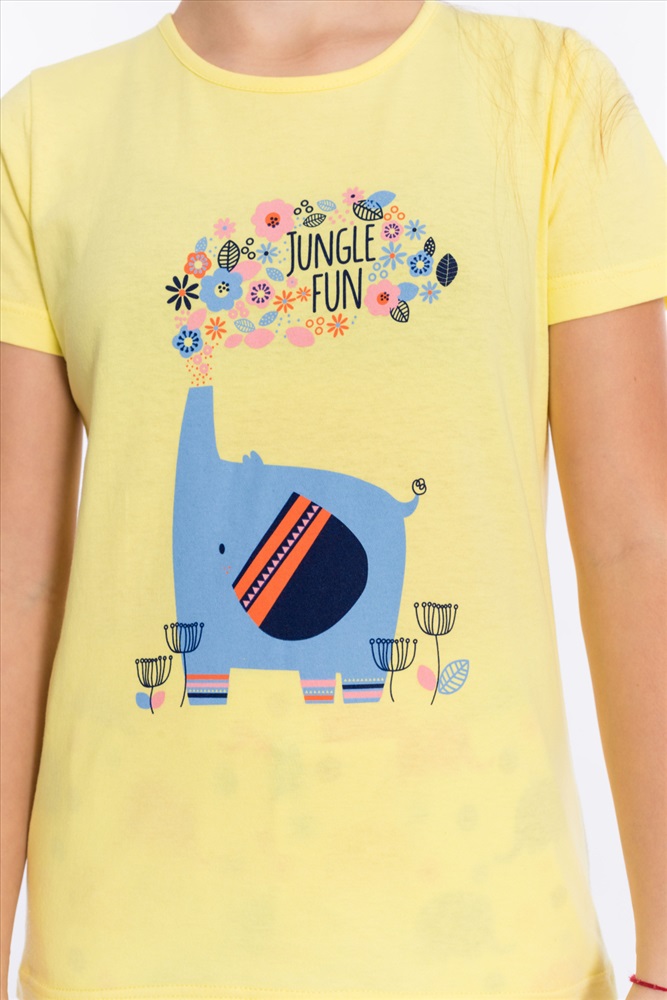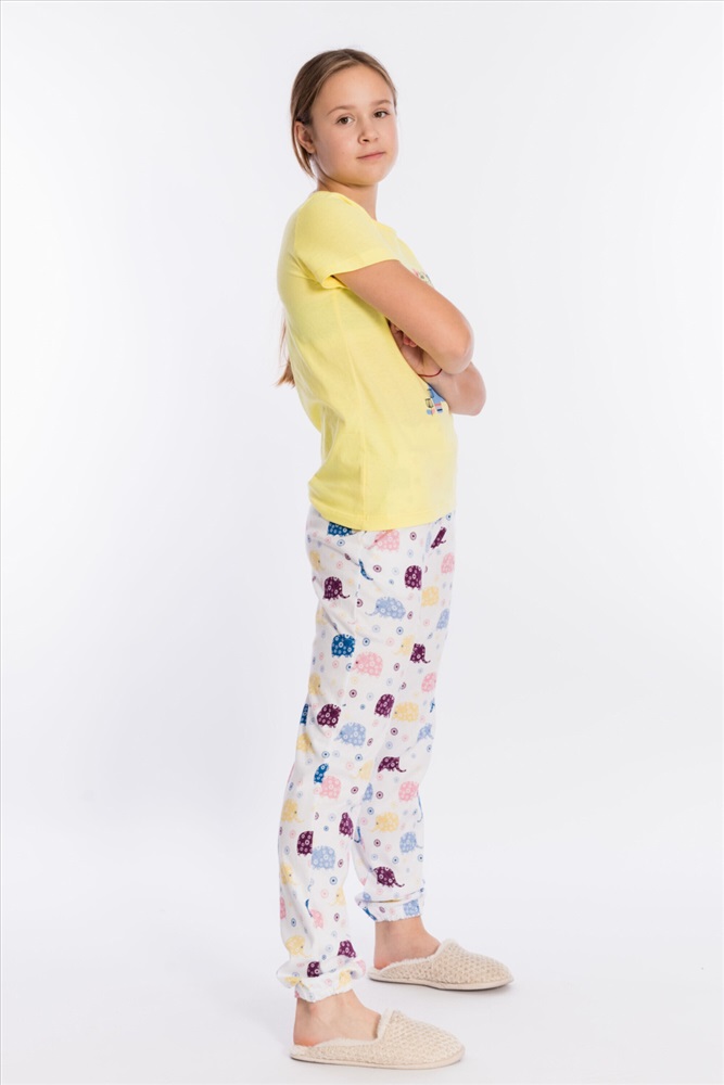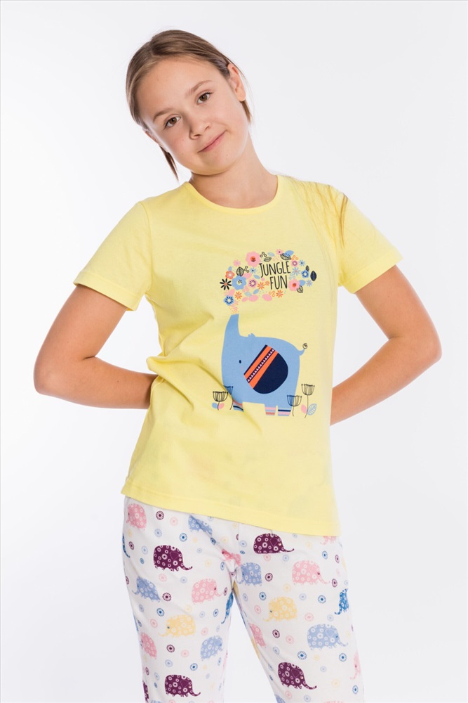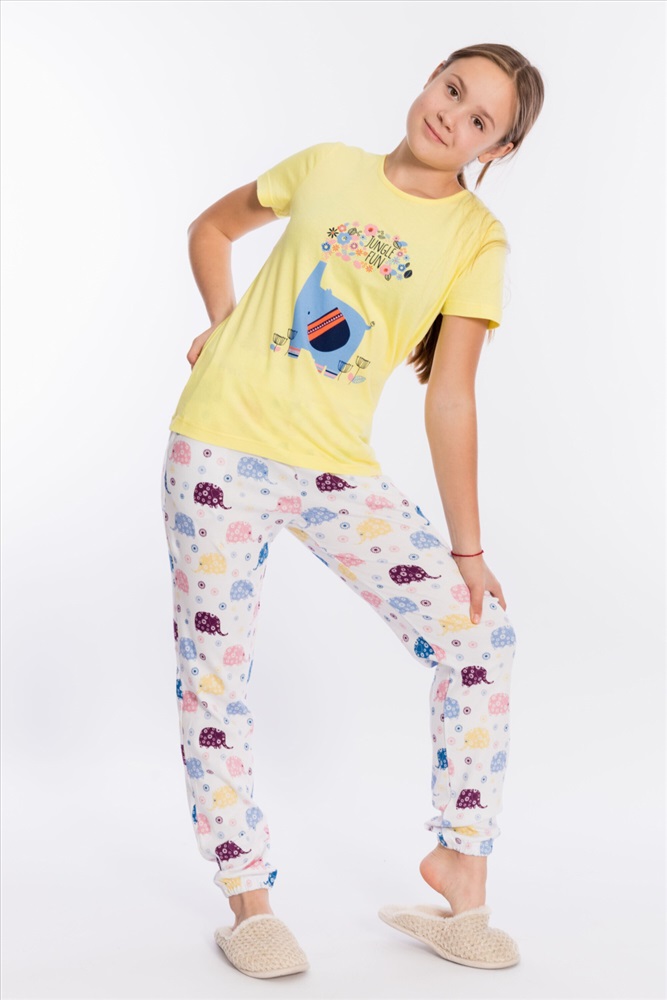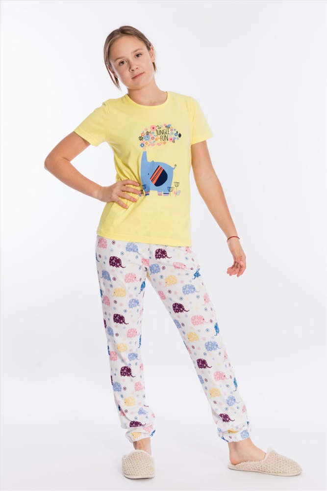 Цвет Номенклатуры: желтый Костюм выполнен из хлопкового полотна, состоит из футболки и брюк. Футболка однотонная, с коротким рукавом, горловина с круглым вырезом обработана бейкой. Спереди расположен принт. Брюки из полотна с набивным рисунком, с боковыми карманами. Пояс и низ брюк на резинке.
