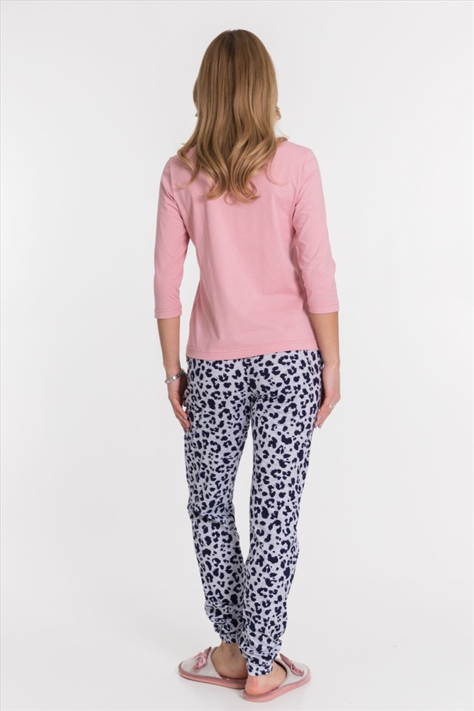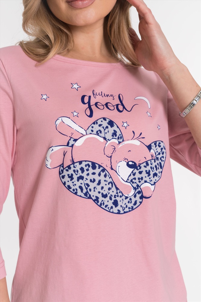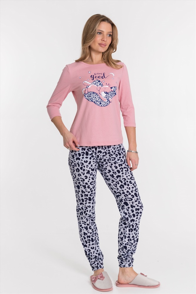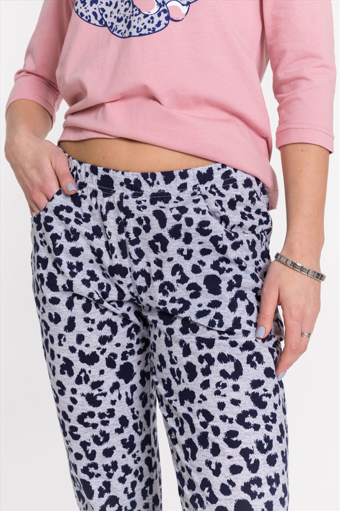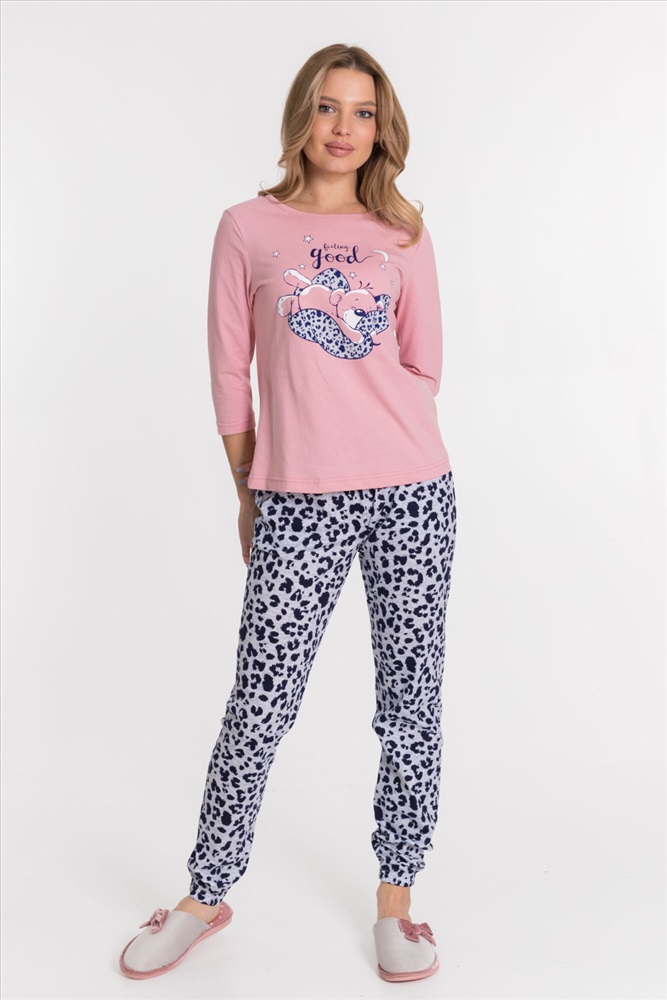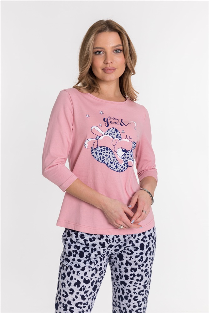 Костюм из кулирки, 100% хлопок. Футболка однотонная, с круглым вырезом горловины, спереди расположен принт. Втачной рукав длиной 3/4. Брюки на резинке сверху и снизу, с боковыми карманами.