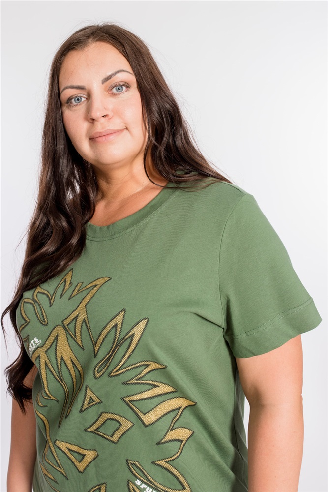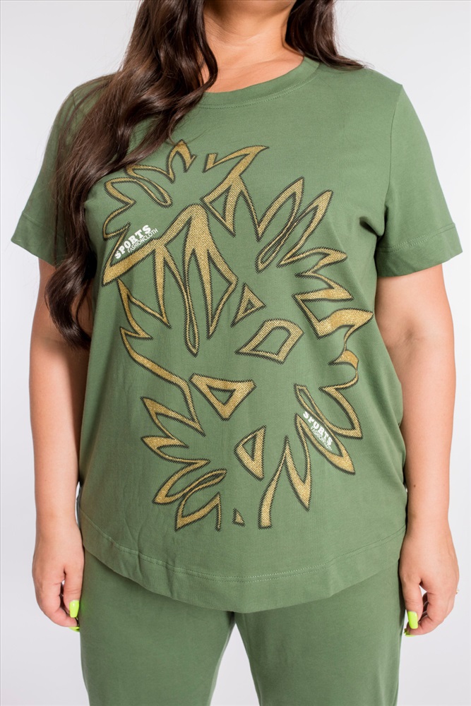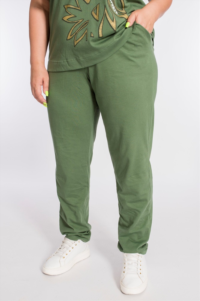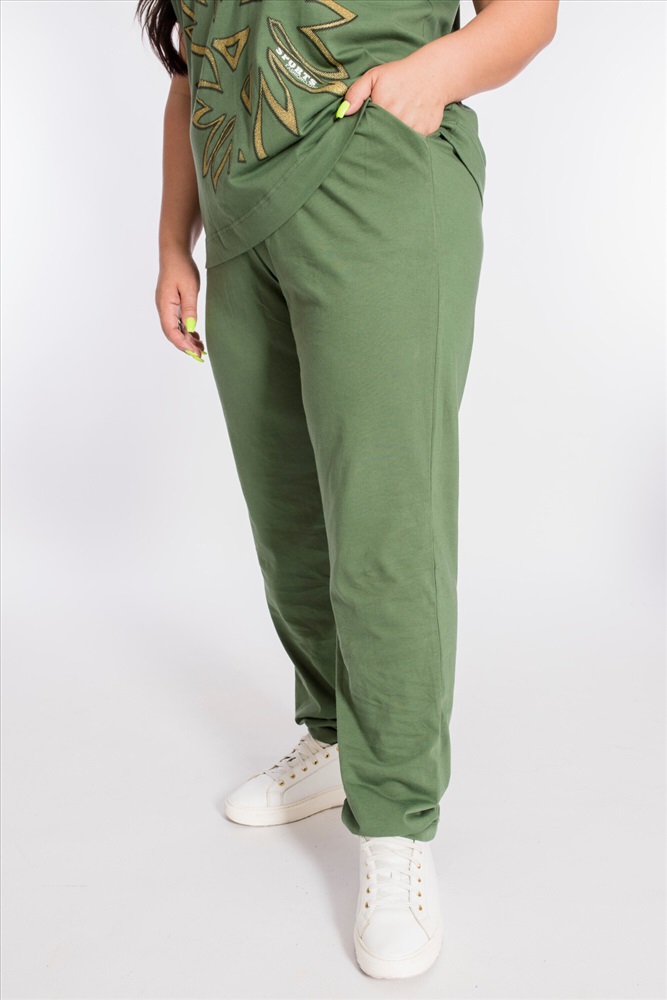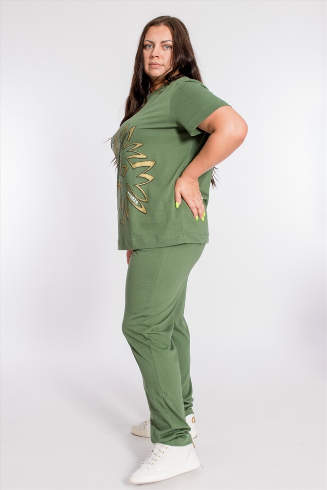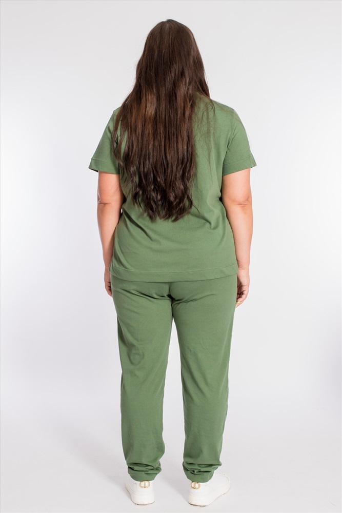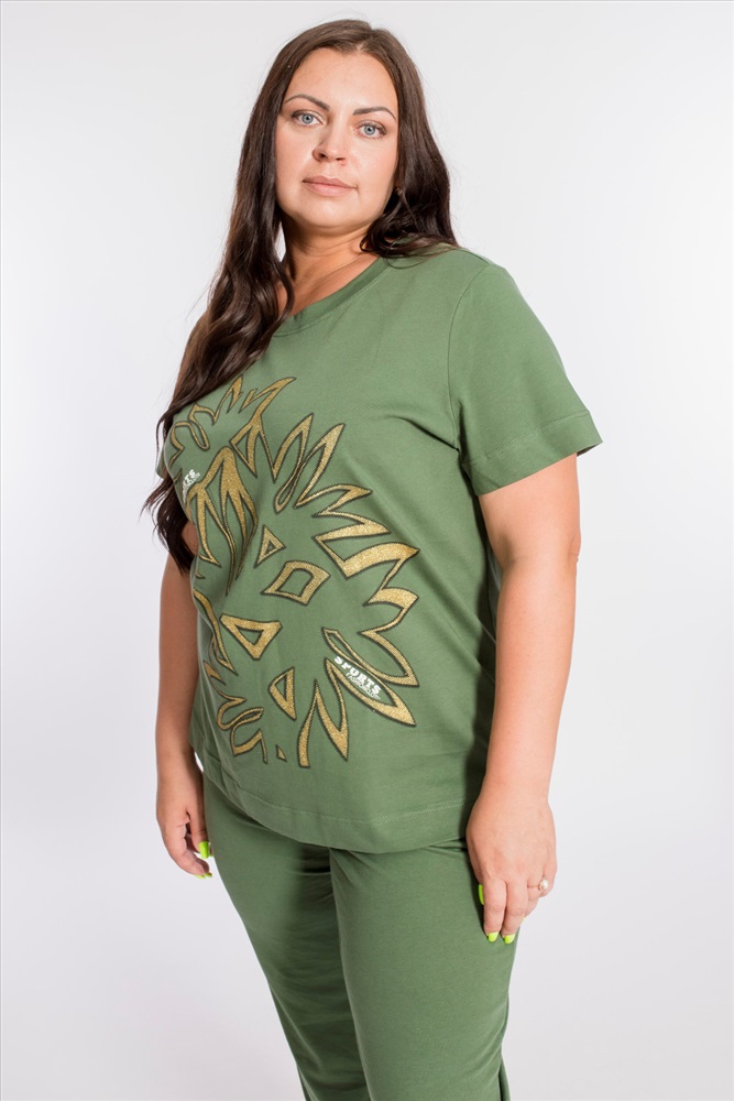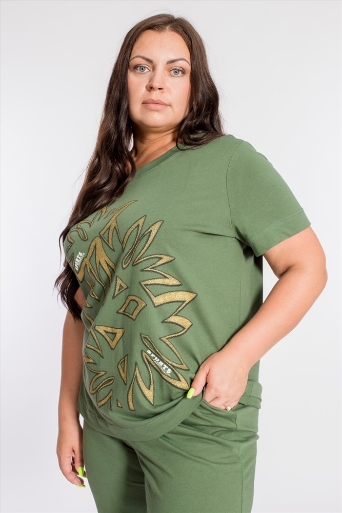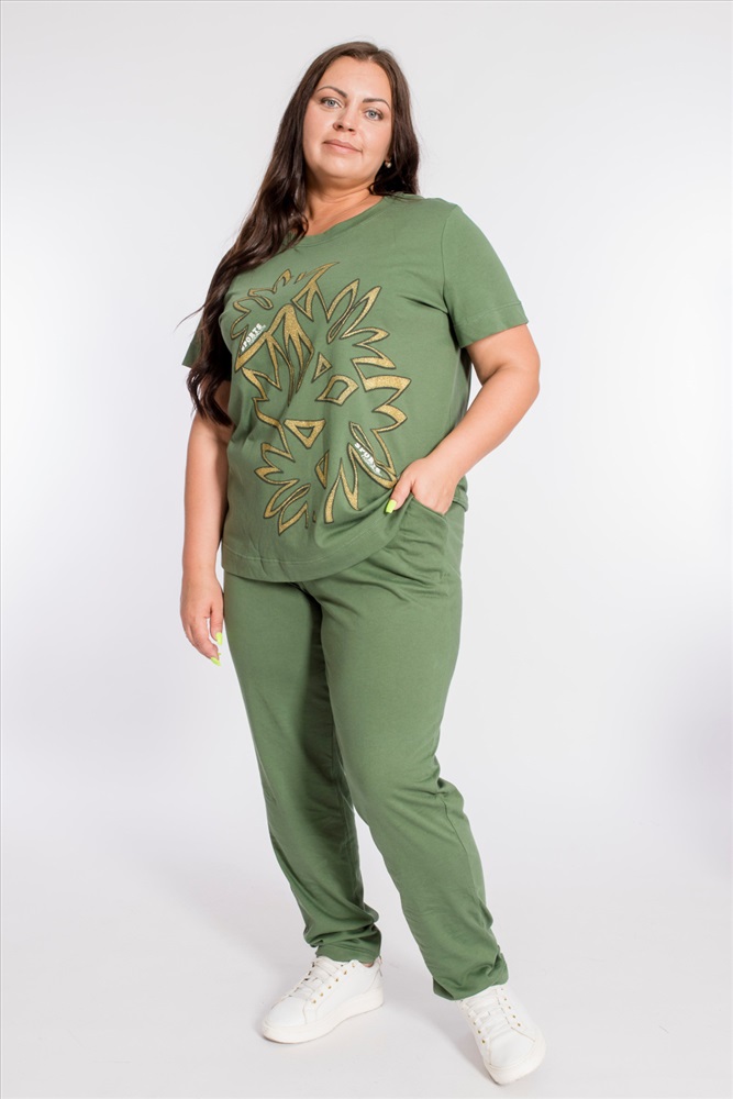 Застежка: Без застежки С капюшоном: Нет С карманами: Нет Сезон: Летний Состав: Хлопок 100% Цвет Номенклатуры: хаки Женский костюм выполнен из хлопкового полотна, состоит из брюк и футболки. Брюки с боковыми карманами и притачным поясом на резинке. Футболка с коротким рукавом и овальным вырезом горловины, обработанным планкой. Спереди на футболке принт. Комментарии к товару