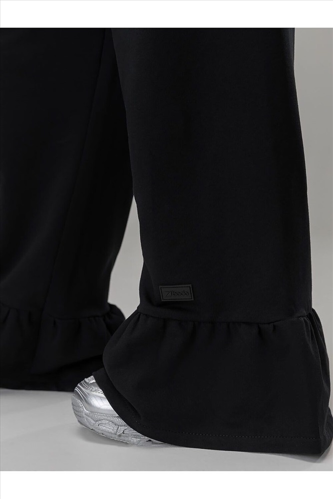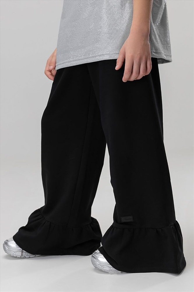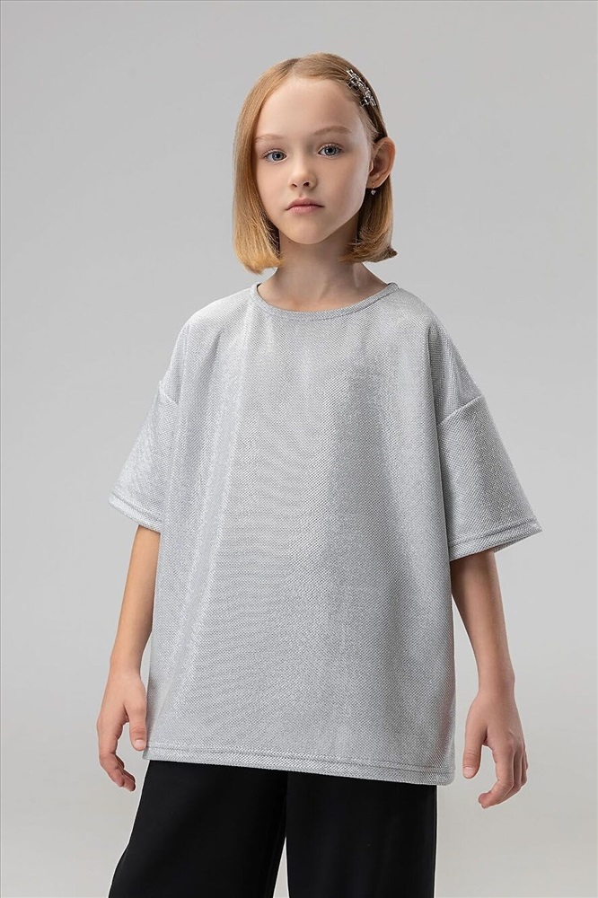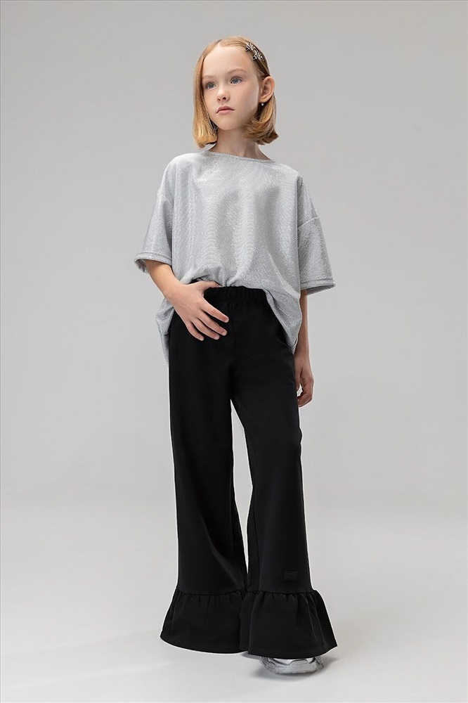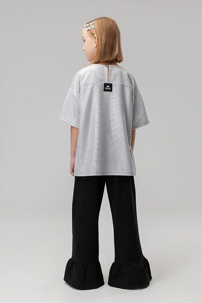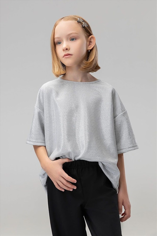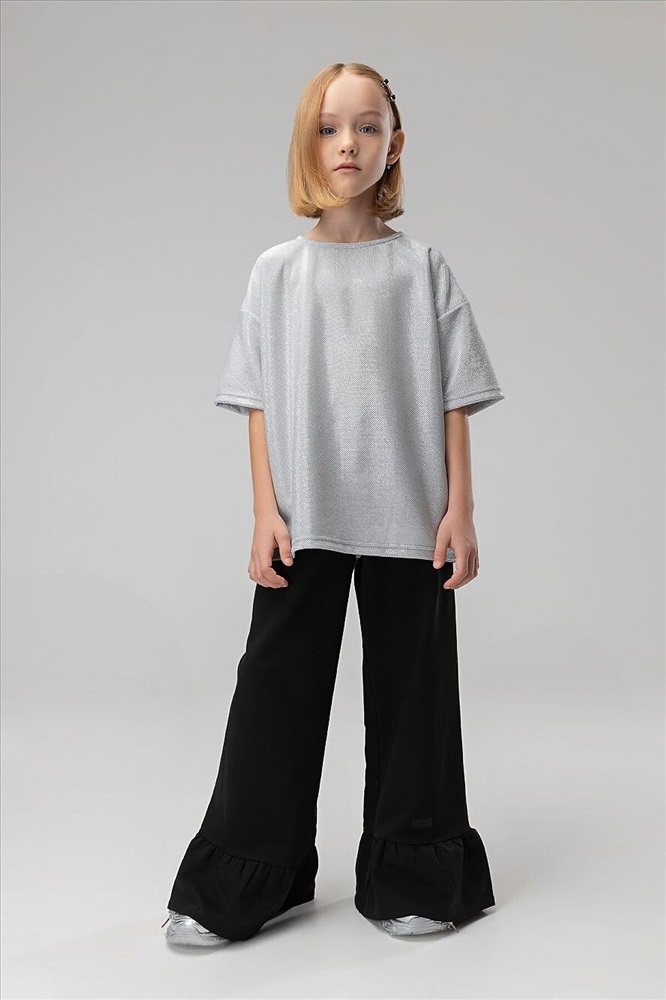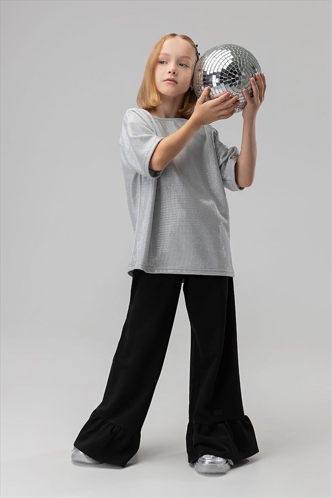 Костюм: футболка и шорты. Свободная футболка со спущенным плечом с коротким рукавом. Горловина футболки округлой формы. По спинке разрез, застежка на пуговицу. Футболка блестящая с люрексом. Брюки прямые свободные на поясе с резинкой. По низу брюк воланы.