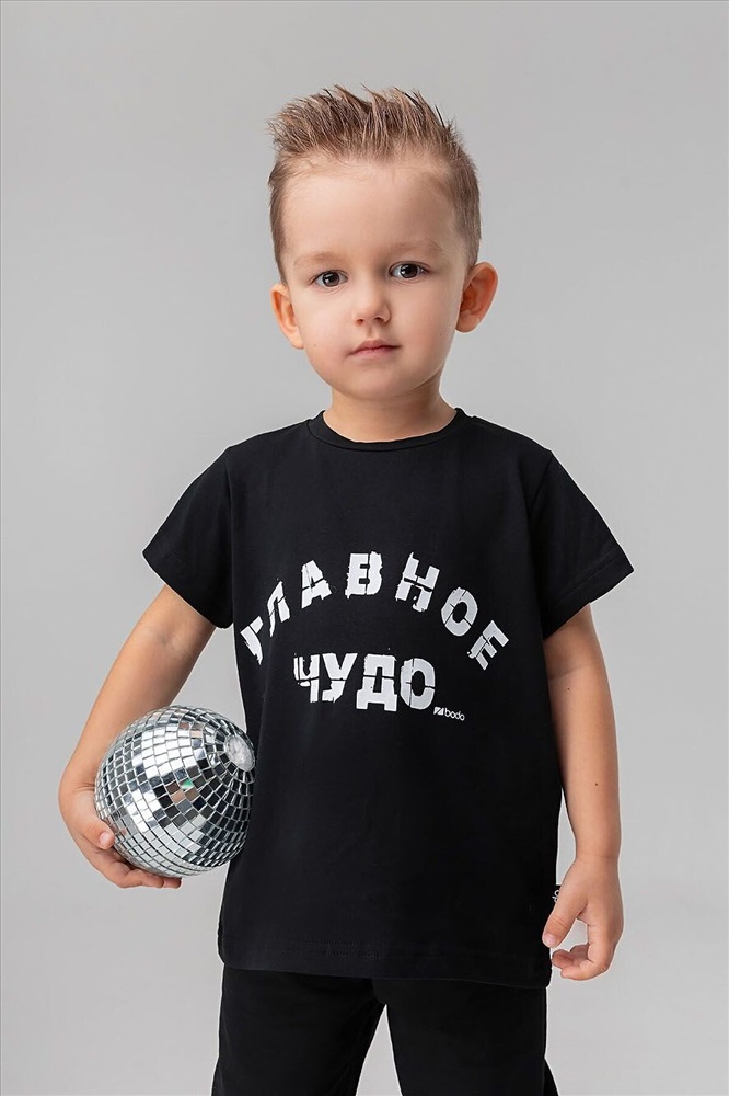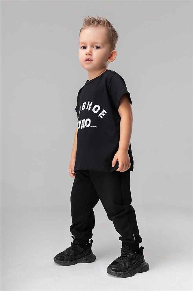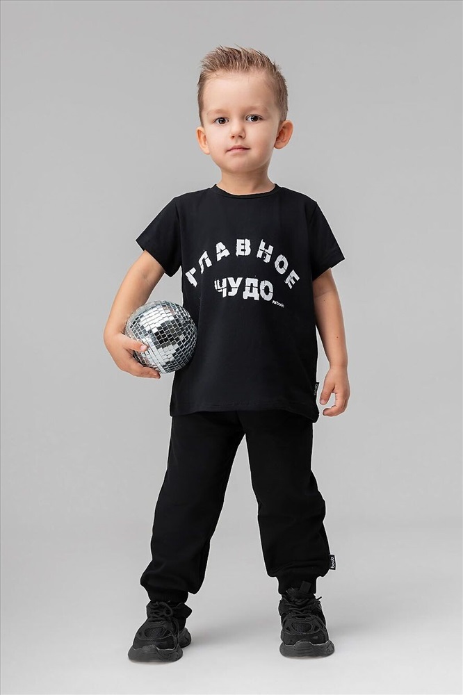 Костюм: футболка и брюки. Прямая футболка с принтом "Главное чудо". Горловина округлой формы. Низ изделия прямой. Брюки прямые на поясе с внутренней резинкой. Брюки с манжетой.
