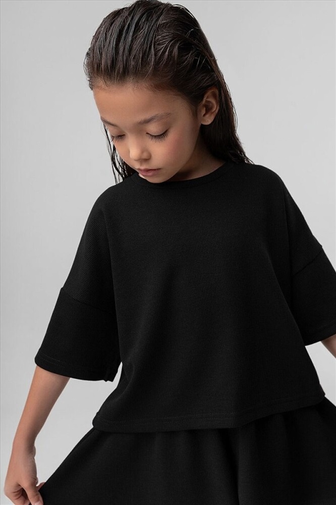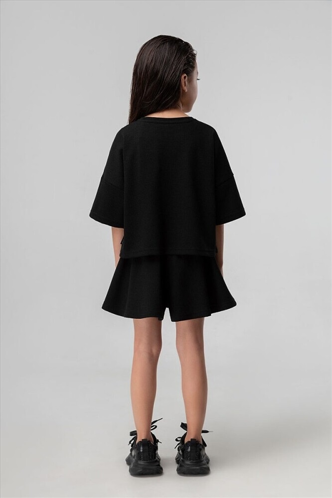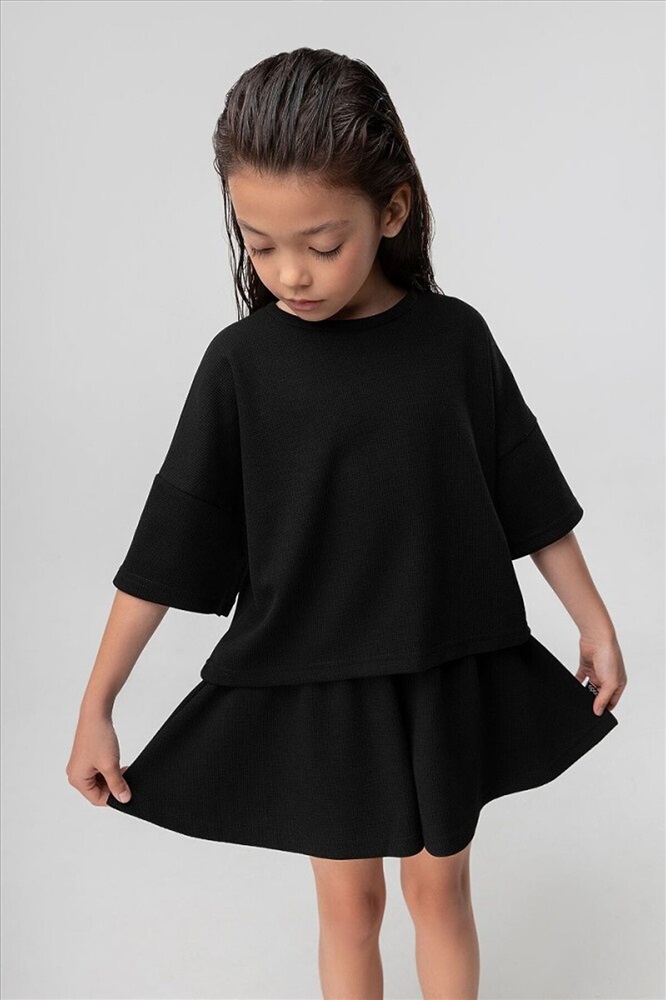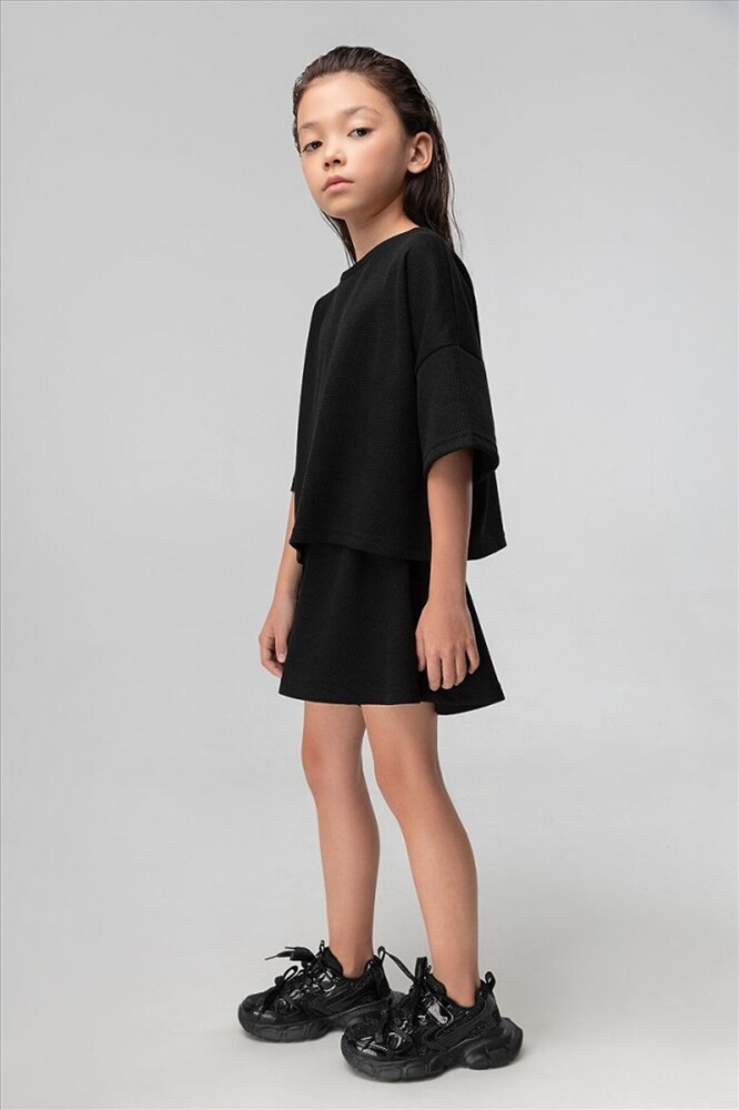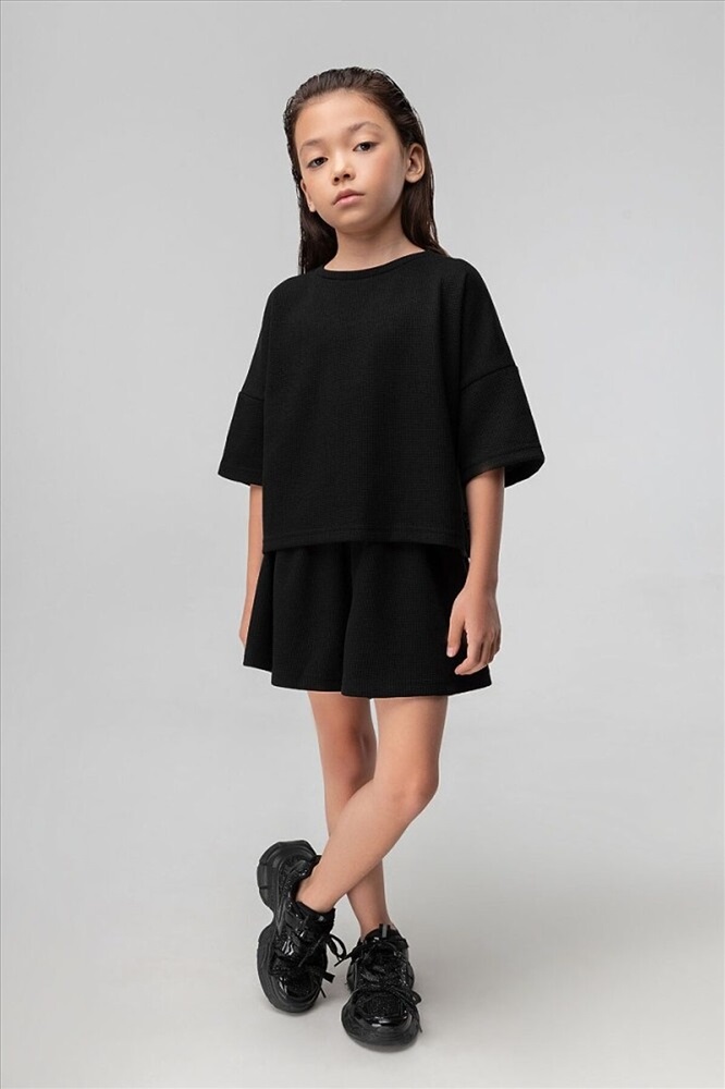 Костюм для девочки из вафельной кулирки: футболка и шорты-юбка. Укороченная футболка свободного силуэта со спущенным плечом с коротким рукавом. Свободные шорты-юбка, пояс на резинке, с боковыми карманами. Внимание: в эти города продукция данного бренда не отгружается. Россия: Владивосток, Хабаровск, Махачкала. Казахстан: Павлодар, Семей, Кокшетау, Балхаш, Костанай, Усть-Каменогорск.