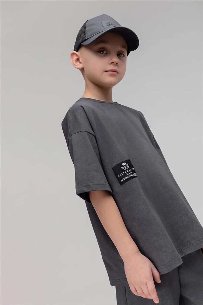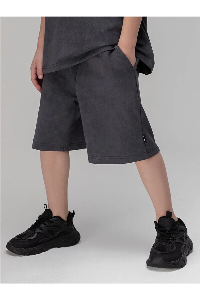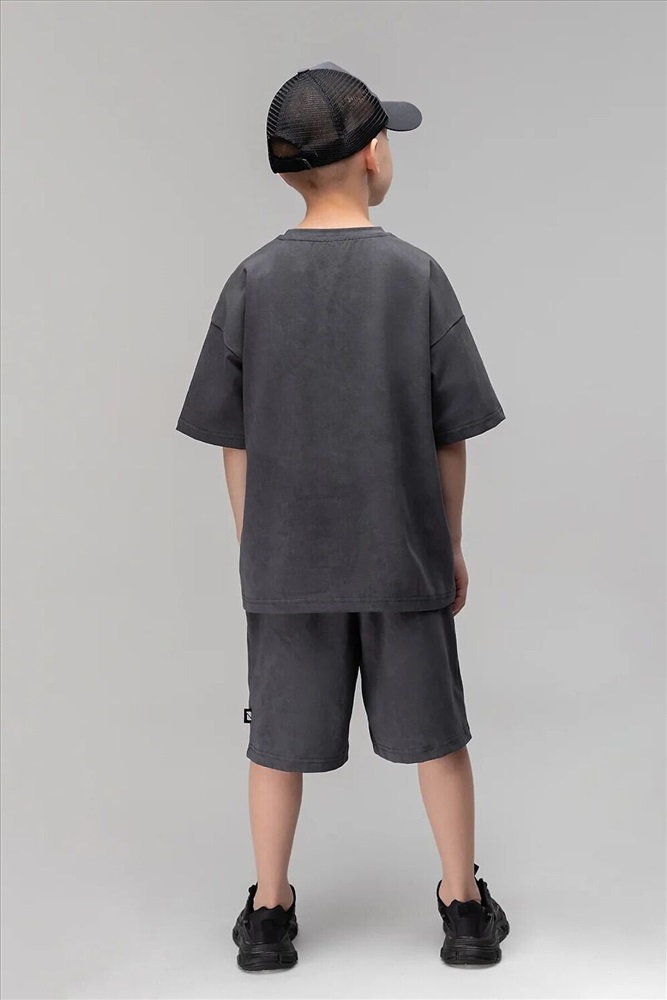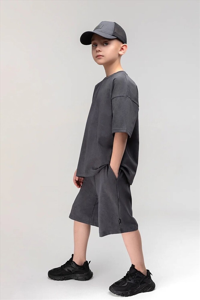 Футболка свободного силуэта со спущенным плечом с втачным коротким рукавом. Горловина футболки округлой формы, обработана рибаной. В комплекте шорты.