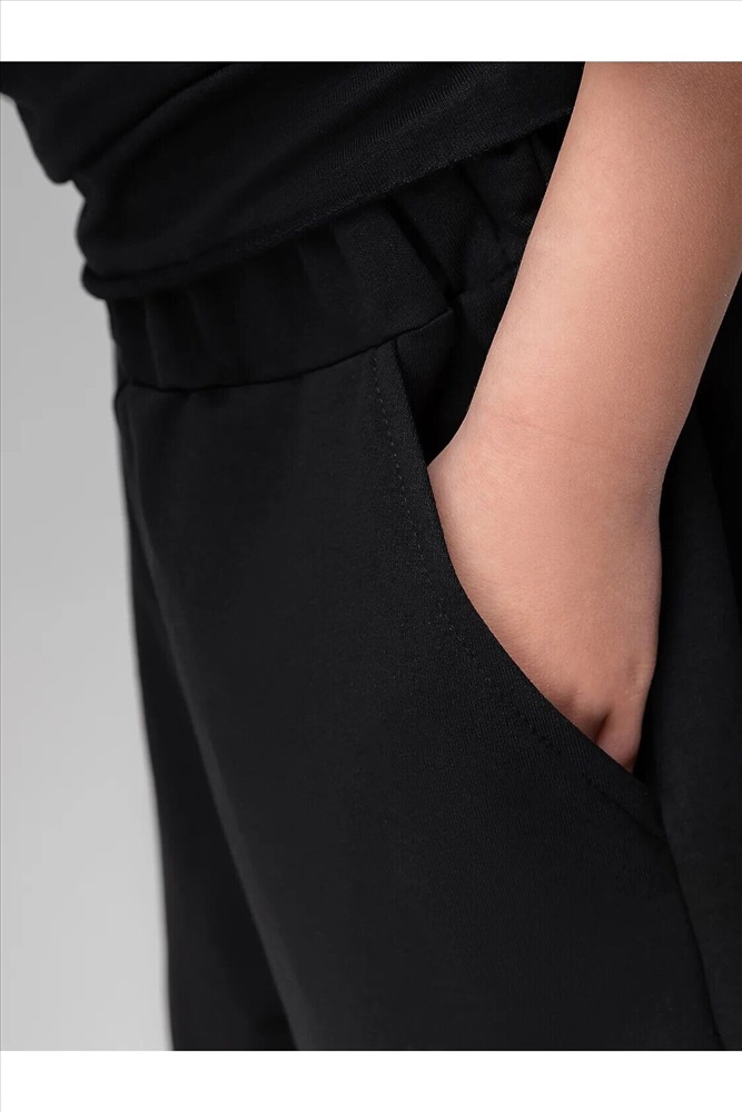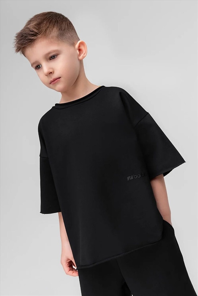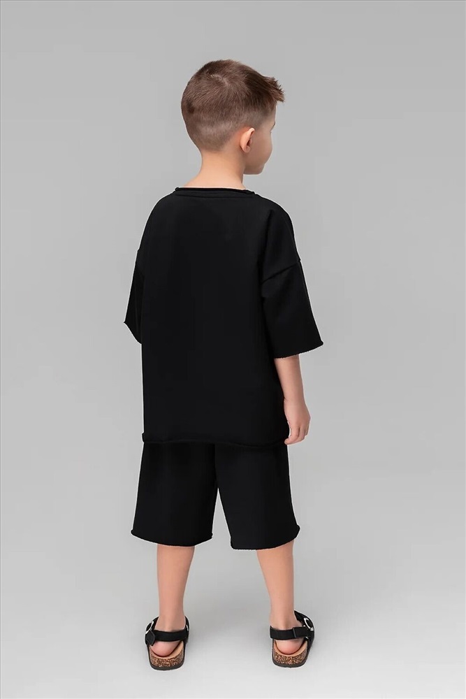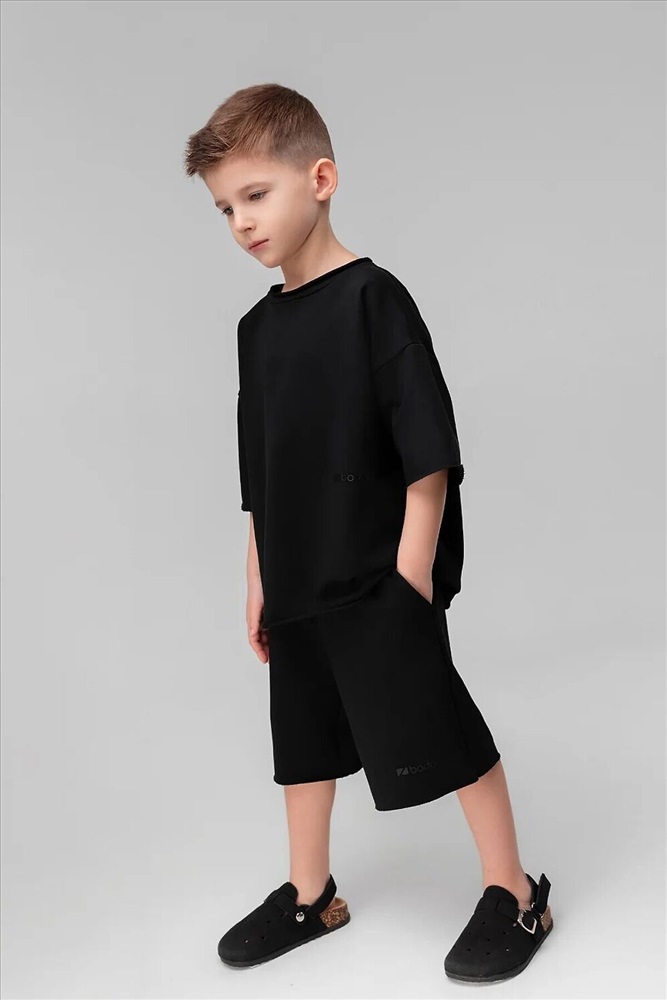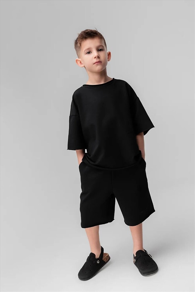 Футболка свободного силуэта со спущенным плечом с втачным коротким рукавом. Горловина футболки округлой формы, обработана рибаной. В комплекте шорты.