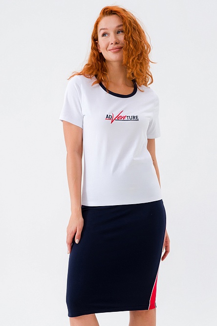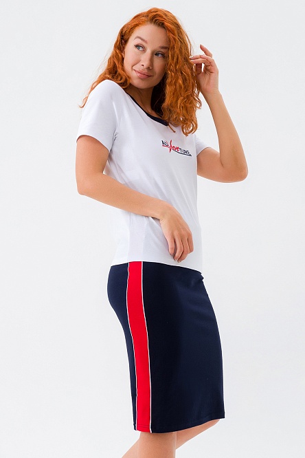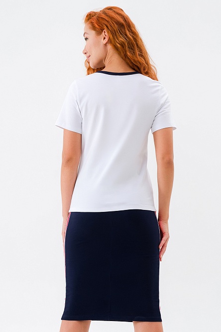 Футболка с принтом и отделкой контрастного цвета подчеркивает индивидуальность, а прямая юбка с эффектными лампасами создает акцент на талии.