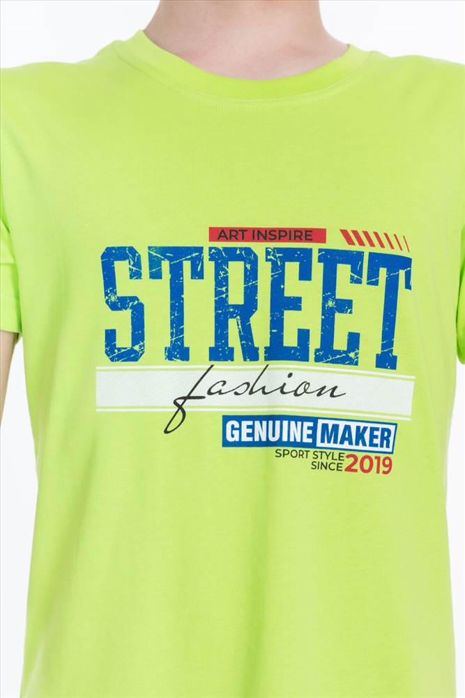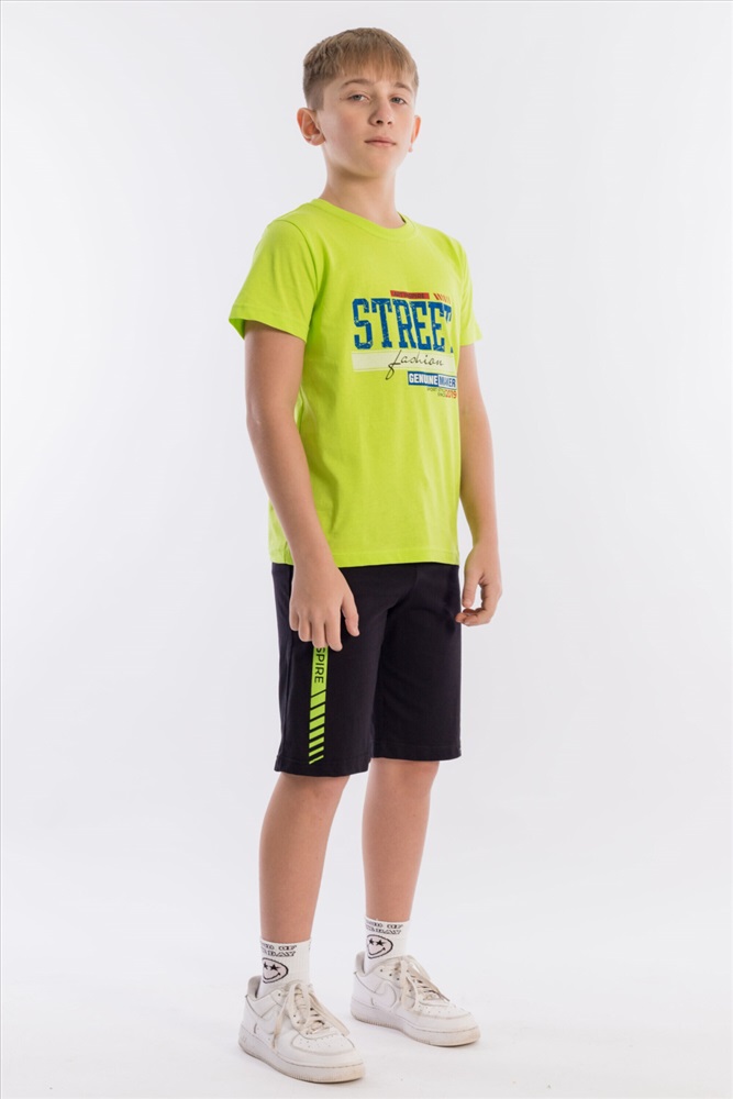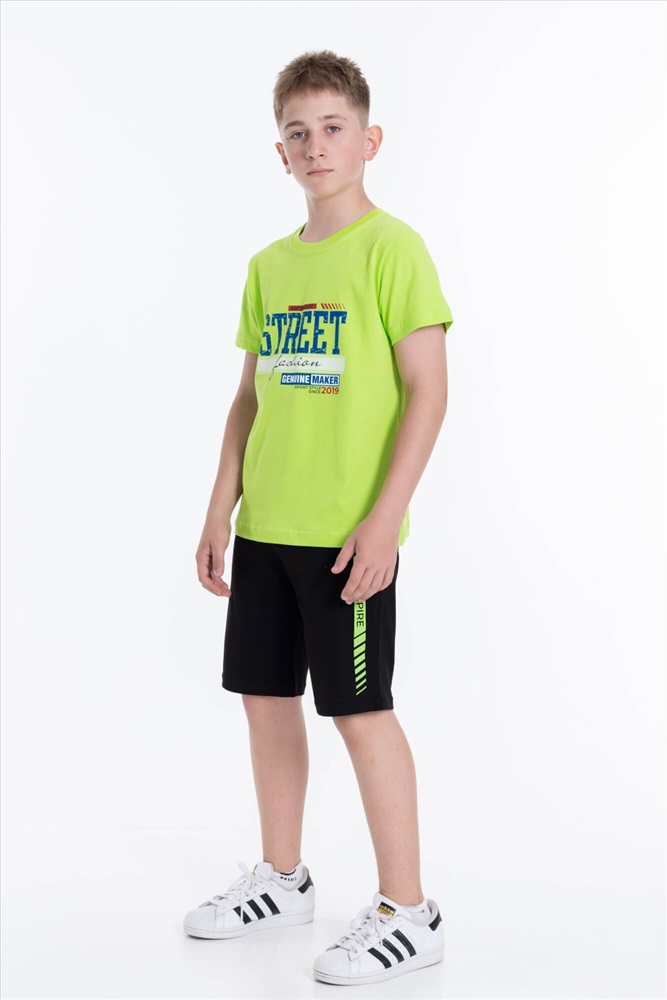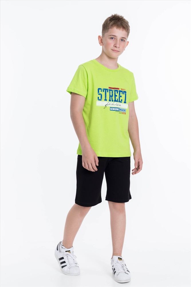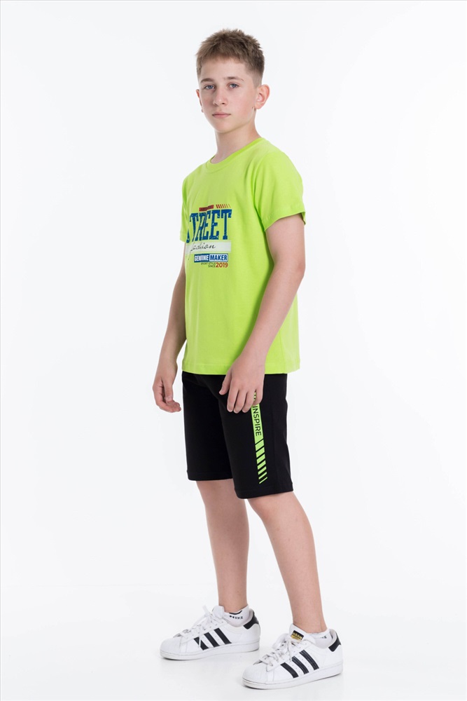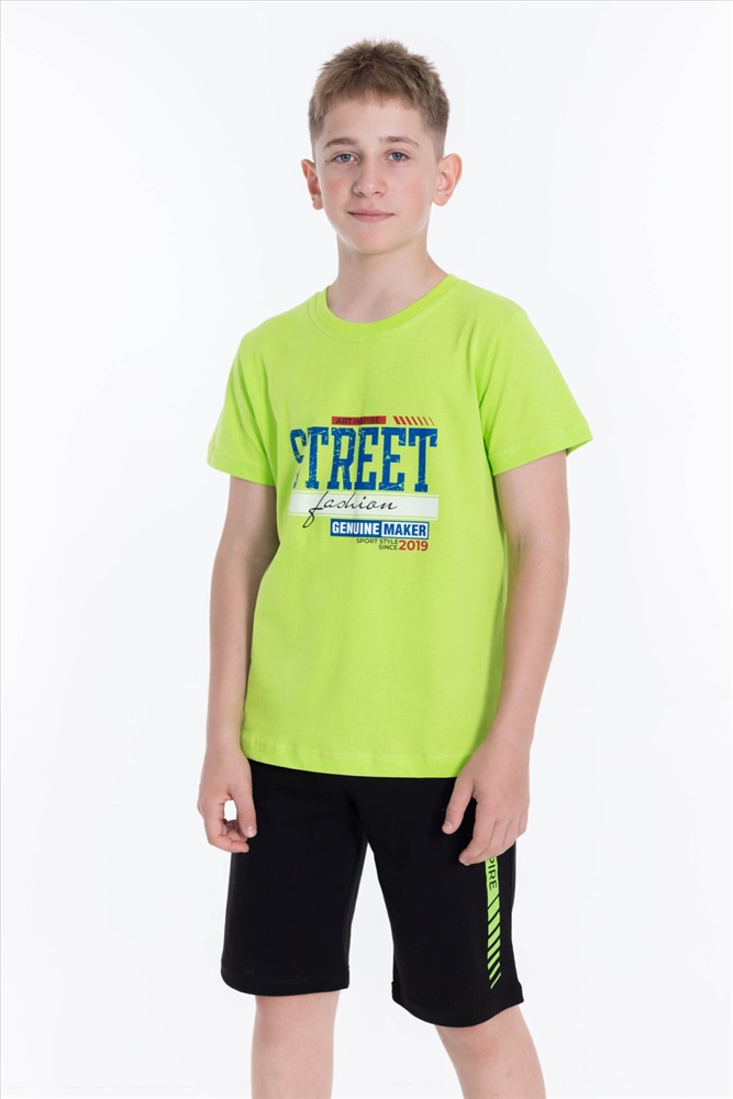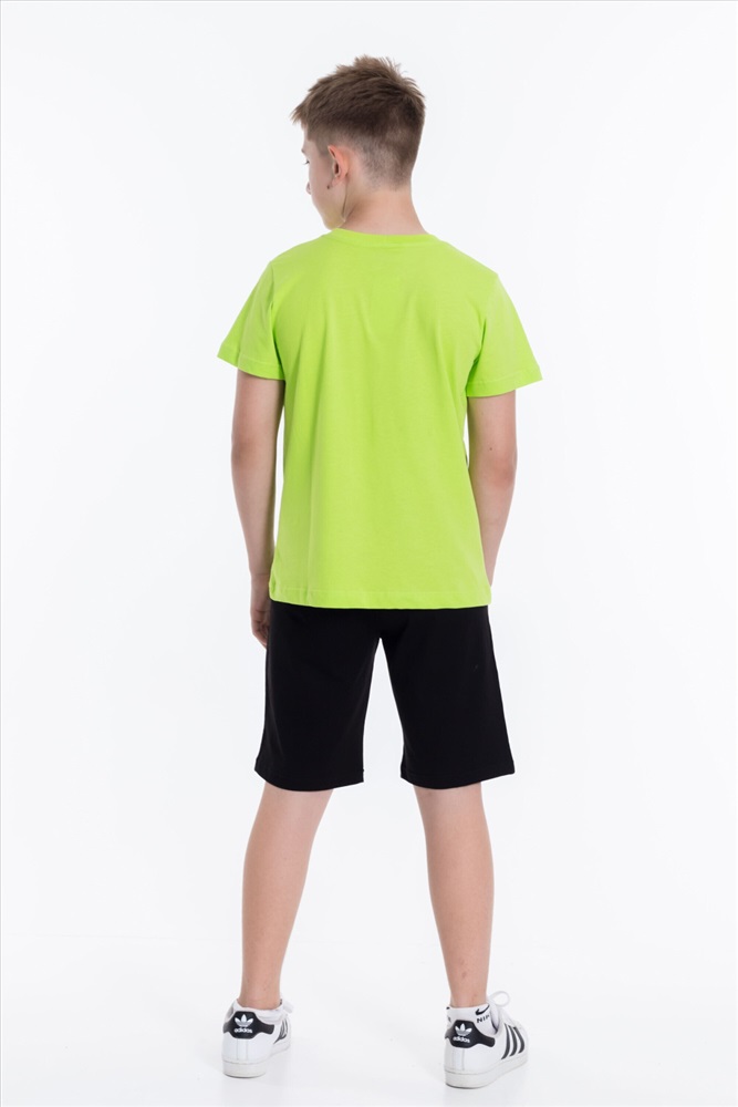 Застежка: Без застежки С капюшоном: Нет С карманами: Нет Сезон: Всесезонный Состав: Хлопок 100% Цвет Номенклатуры: салатовый Костюм для мальчика Футболка - круглый вырез горловины, втачной рукав, принт на полочке Шорты - пояс на резинке, принт по бокам Комментарии к товару