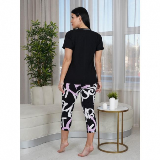 Очаровательный костюм - пижама женская из мягкого и нежного натурального хлопка, очень приятного к телу. Состоит из удлиненной футболки с коротким рукавом и укороченных брюк бриджей с карманами. Удобные штаны на резинке на талии не стеснят движения даже во время активной игры с ребенком, а майка свободного кроя скроет недостатки фигуры. Комментарии к товару