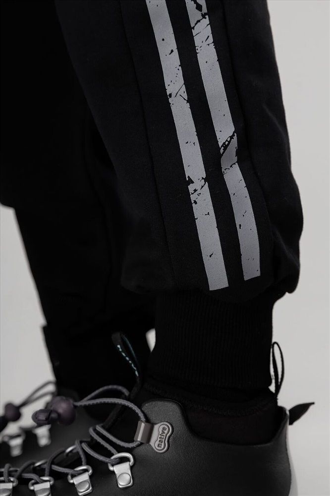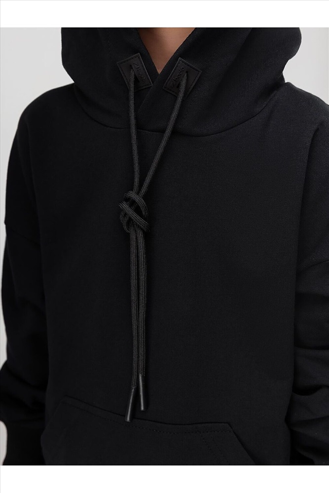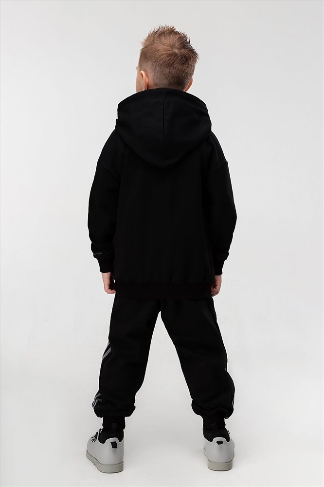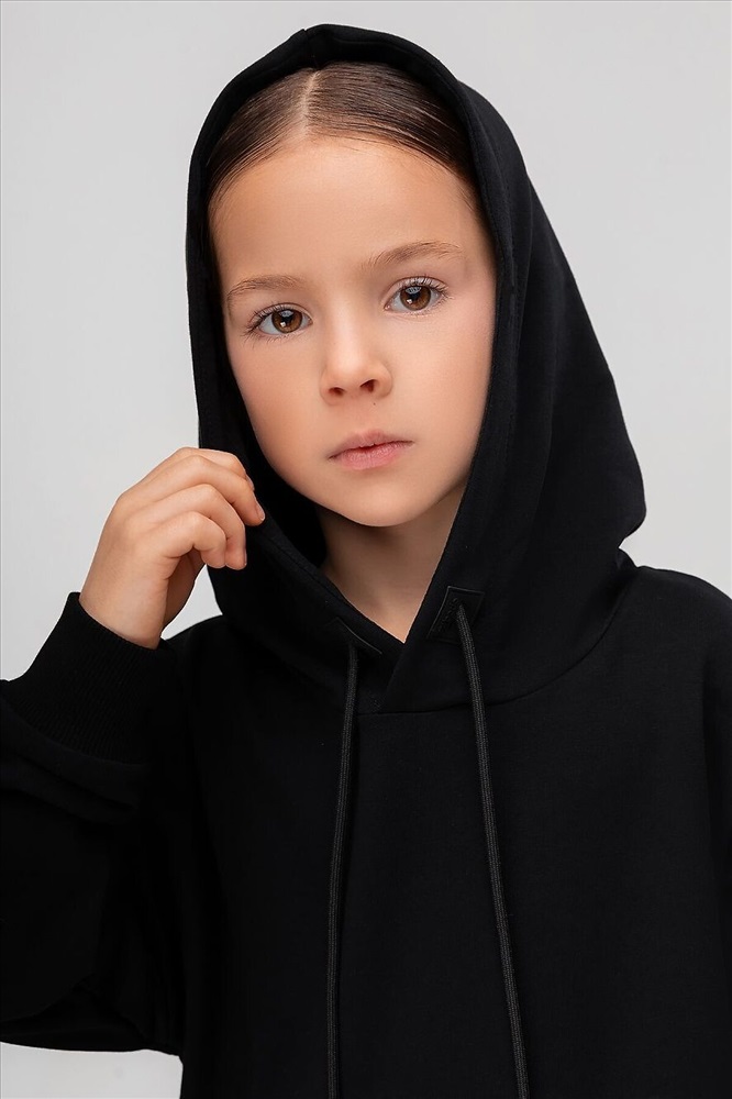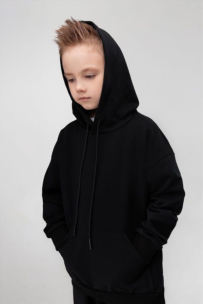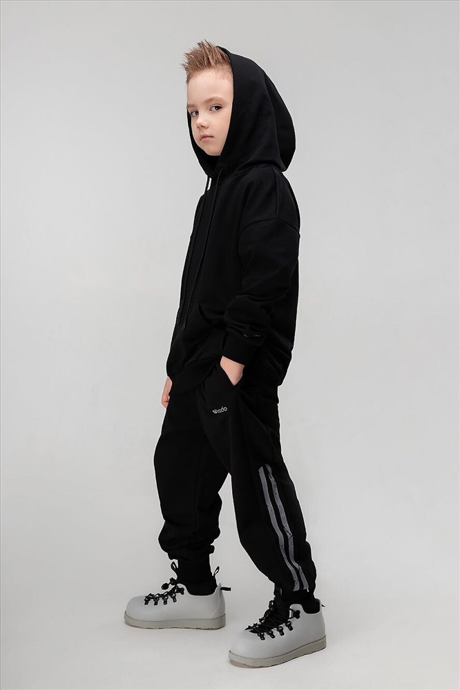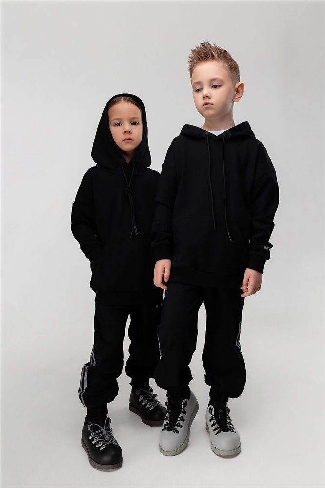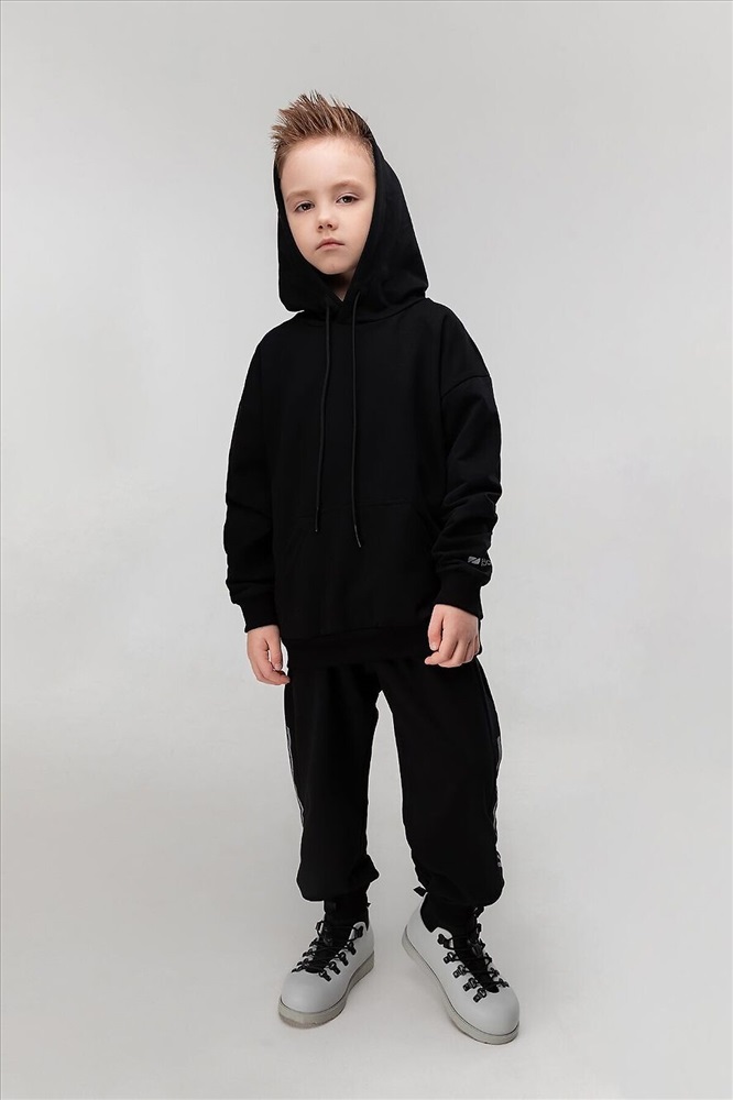 Костюм: толстовка и брюки. Свободная толстовка с капюшоном на шнурке, на полочке располагается карман "кенгуру". Толстовка на поясе по низу изделия. Брюки свободного силуэта, с лампасами по боковым швам, с карманами расположены в швах. Брюки на поясе с резинкой, по низу манжеты.