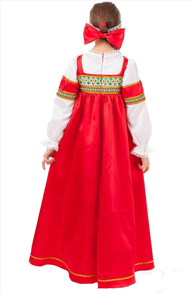 Кто на свете всех милей, всех румяняй и белей? Та, что придет на праздник в карнавальном костюме Марьюшка от бренда Пуговка. Этот яркий и самобытный образ в традиционном народном стиле порадует и взрослых, и детей. Костюм качественно пошит и прекрасно смотрится в любой обстановке. В комплектацию наряда входит сарафан и лента на голову. Особенности: Сарафан красного цвета с имитацией белой рубашки Рукава рубашки украшены цветными вставками и оборками С круглым декорированным воротником Длинный сарафан с вставками из орнаментального узора Застежка-молния на спинке Головная лента с бантиком сзади