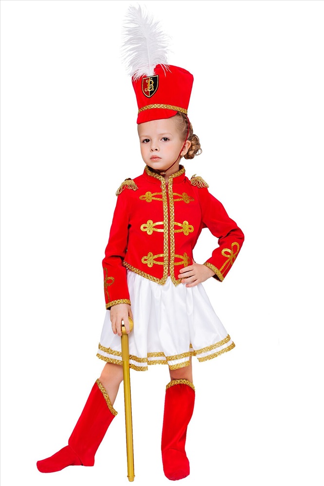ID товара: 208758 Состав: 100% Полиэстр Сезон: Весна/Лето Длина: Миди Фасон: Расклешенный Рукав: Длинный Вид застежки: Молния Вырез горловины: Стоечка Рисунок: Без рисунка Декоративные элементы: Нашивка Основная ткань: Полиэстер Стиль: Нарядный Страна бренда: Россия Страна производства: Россия Карнавальный костюм Мажоретка - яркий и современный образ, пришедший к нам из западной традиции. Мажоретки - участницы военизированных парадов и маршей, идущие впереди оркестра с барабанами и тросточками, танцующие и всячески заводящие толпу. Что-то типа черлидерш, только в военном стиле. Костюм Мажоретка идеально подойдет активной девочке, которая не боится быть в центре внимания. Наряд подойдет для Хэллоуина, Нового года, различных номеров и спектаклей. Комплект состоит из мундира, юбки, кивера, сапог и трости. Особенности: Красный мундир с высоким воротником и золотыми эполетами Юбка белого цвета с золотым подолом Красный кивер с украшением в виде белого султана и нашивки с гербом Сапоги из текстиля декоративные (надеваются поверх обуви) Золотая тросточка Комментарии к товару
