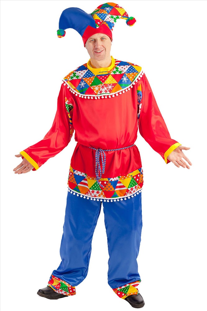 Комедийный персонаж русского народного кукольного театра, Петрушка создает веселье везде, где он появляется. Наряд Петрушки обычно бывает ассиметричным и нелепым. Мы постарались воплотить этот образ как можно ярче и интереснее в данной модели карнавального костюма для взрослых. Его вы сможете надеть на Новый год, театрализованное представление и другие костюмированные мероприятия. В комплект образа входит рубаха, штаны и колпак. Особенности: Красная рубаха с поясом Воротник и низ рубахи имеют вставки с разноцветными треугольниками Декор в виде маленьких бомбошек Брюки синие свободного кроя с принтом в нижней части Шутовской колпак с двумя концами и принтом с одной стороны Рост: 176
