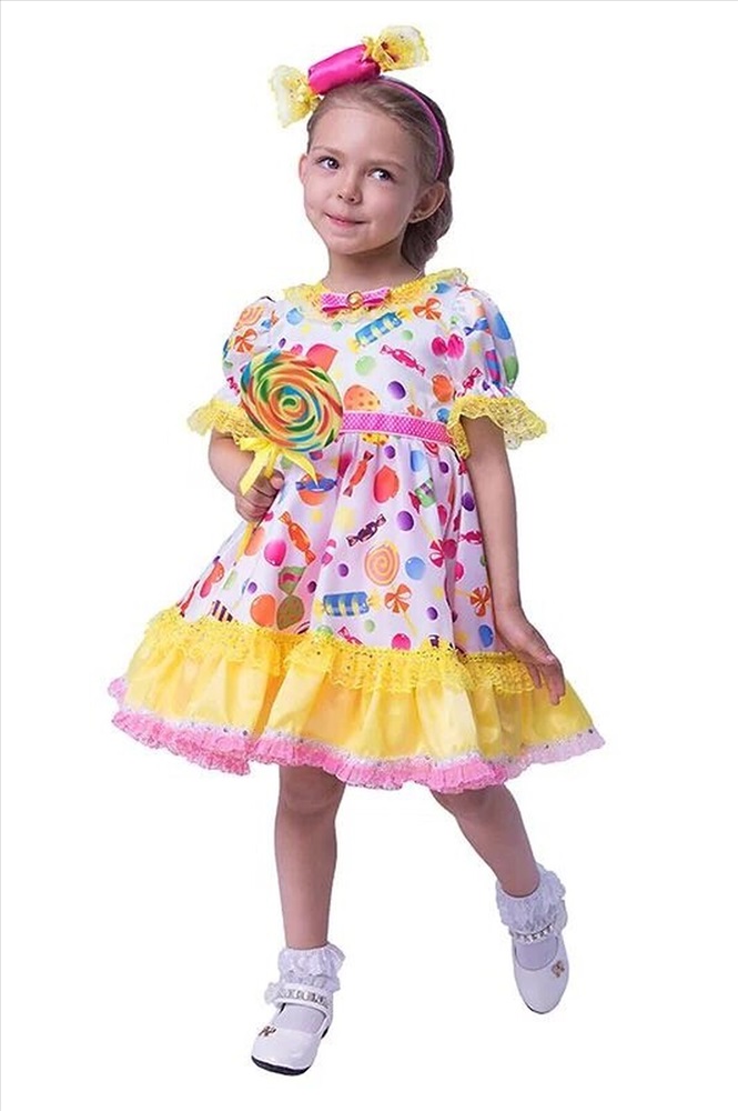Карнавальный образ Конфетка подарит отличное настроение на весь день! Яркий и оригинальный наряд для девочек 3-9 лет. В комплекте образа платье и ободок. Особенности: -Яркое разноцветное платье с оборками -Короткие рукава-фонарики с кружевной оторочкой -Воротник с декором желтым кружевом и розовым бантиком -Принт со сладостями -Ободок розовый с конфеткой