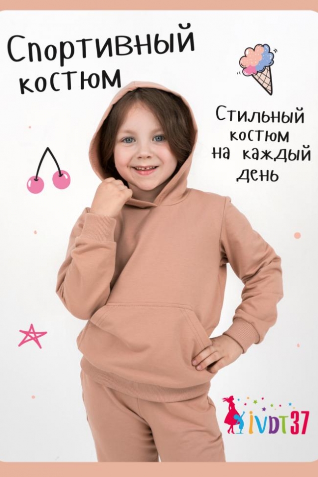 Костюм для девочек дошкольного и младшего школьного возраста. Костюм состоит из толстовки и штанов. Костюм из трикотажного эластичного хлопкового однотонного полотна футер. Толстовка с капюшоном, с длинным рукавом на манжете и поясе из основного полотна. На переде толстовки расположен карман-кенгуру. Штаны с боковыми карманами, на манжетах и поясе из основного полотна.