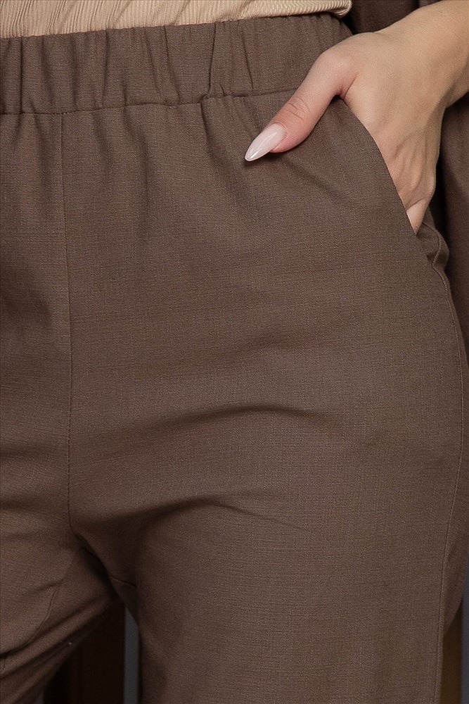 Состав: 100% хлопок. Материал: хлопок-стрейч. Цвет: кофейный. Принт: отсутствует. Силуэт: полуприлегающий. Карманы: есть. Резинка в поясе: есть. Вид застежки: без застёжки. Декоративные элементы: пояс из основной ткани на двух полукольцах в комплекте. Длина верха: 46/ 67 см, 48/ 68 см, 50/ 69 см, 52/ 70 см, 54/ 71 см, 56/ 72 см. Длина брюк: 46-56/ 103 см.