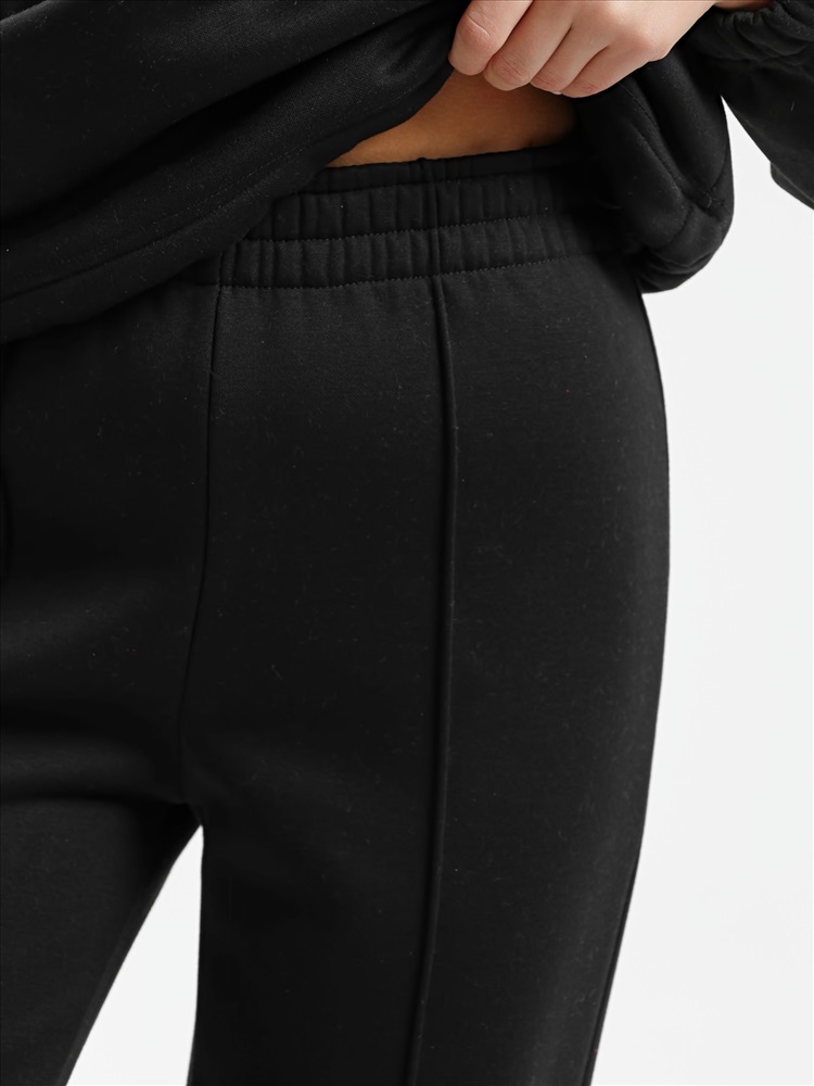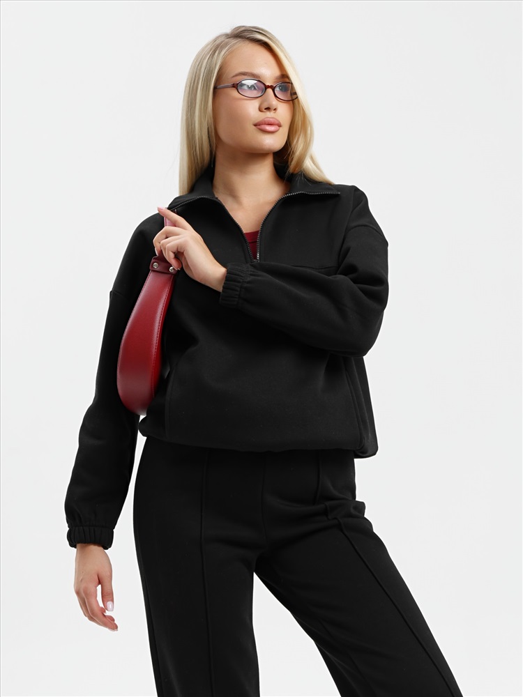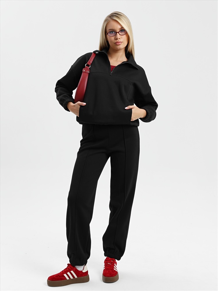 Костюм молодежный из трикотажного гладкокрашенного полотна «еврофлис», Джемпер - свободного покроя, с длинными втачными рукавами, нижние срезы которых обработаны эластичной тесьмой, воротником-стойкой и карманами в рельефных швах. Полочка - с отрезной кокеткой из двух частей, с застежкой "молния", обработанной в соединительном шве. Низ изделия с подгибкой и регулируется по ширине с помощью фиксатора.Брюки – длинные, полуприлегающего силуэта, на поясе с эластичной тесьмой внутри и карманами в боковых швах. Передние половины застрочены по центральным линиям.
