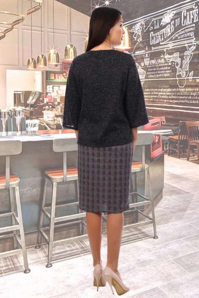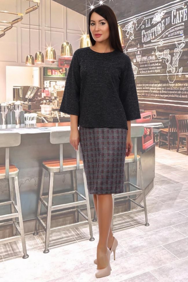 Костюм на каждый день - удобная кофта свободного кроя, рукава 3/4, горловина обработана кантом. Контрастная юбка-карандаш визуально вытягивает и стройнит фигуру. Плюс костюма в том, что каждую деталь можно комбинировать с другими вещами Вашего гардероба. Юбку можно сочетать с любыми блузками, а кофта отлично подойдет к джинсам и классическим брюкам. Также под кофту можно надеть водолазку для более теплого и уютного образа.