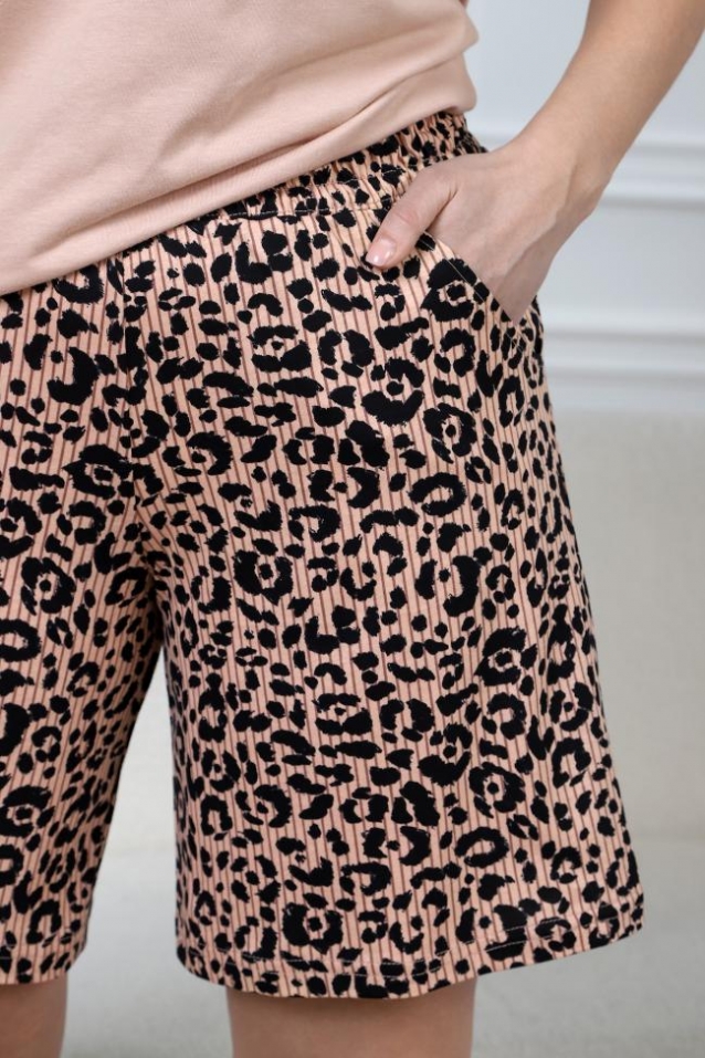 Костюм молодежный из трикотажного полотна «кулирка» в комбинации двух видов в единой цветовой гамме: гладкокрашеного и с набивным рисунком, состоящий из футболки и шорт. Футболка – из гладкокрашеного полотна, с короткими цельнокроеными рукавами, горловиной V-образной формы, обработанной втачной планкой и принтом на полочке, выполненным в технике «шелкографии».Шорты – удлиненные, из полотна с набивным рисунком, на притачном поясе с эластичной тесьмой внутри и карманами в боковых швах.