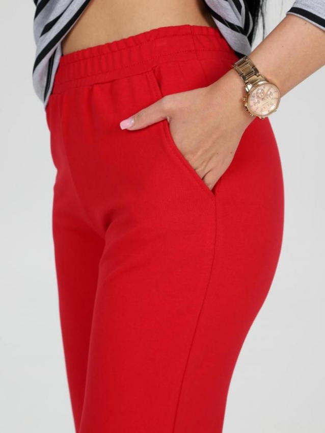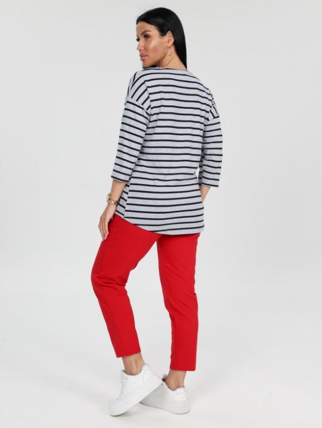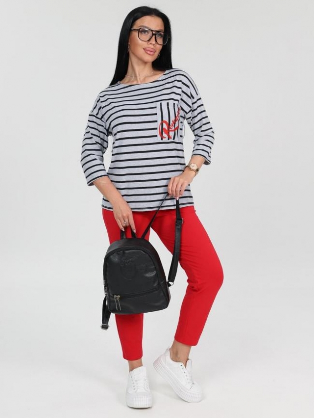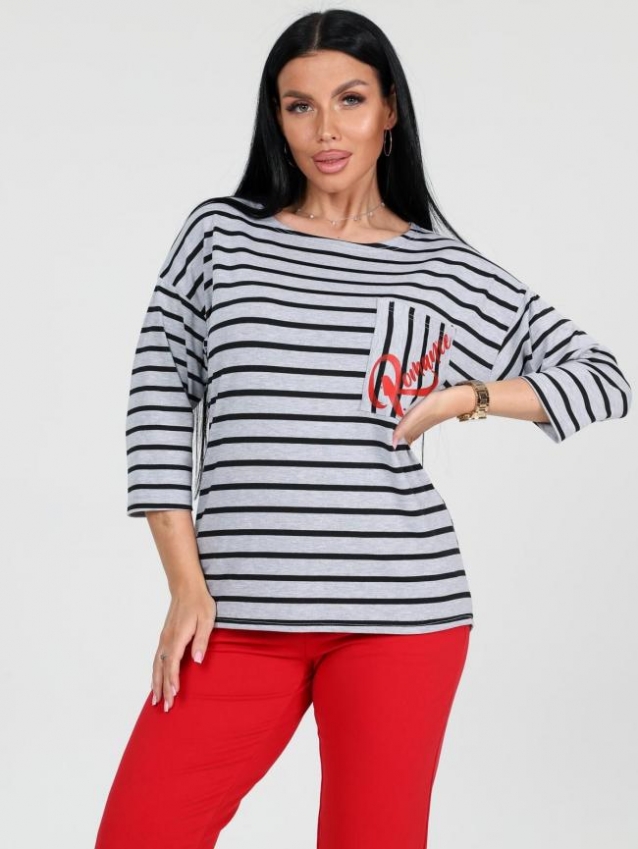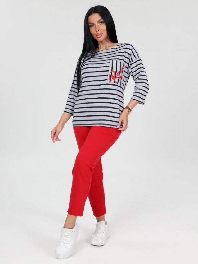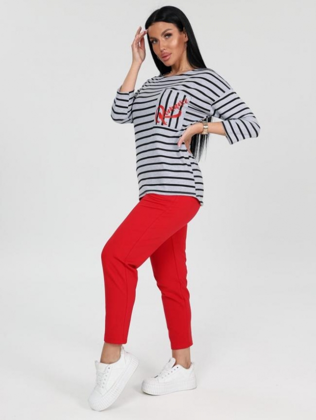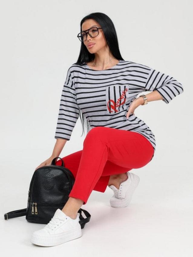 Женский костюм состоит из футболки и брюк. Брюки длиной 7/8 с карманами в боковых швах. Футболка удлинённая прямого силуэта со скруглённой линией низа спинки. Рукав длиной 3/4. На полочке кармашек с принтом в цвет брюк. Комментарии к товару