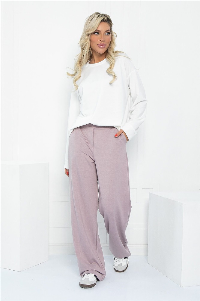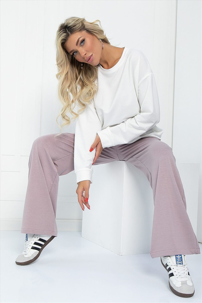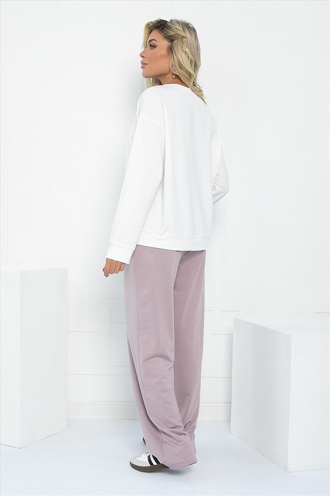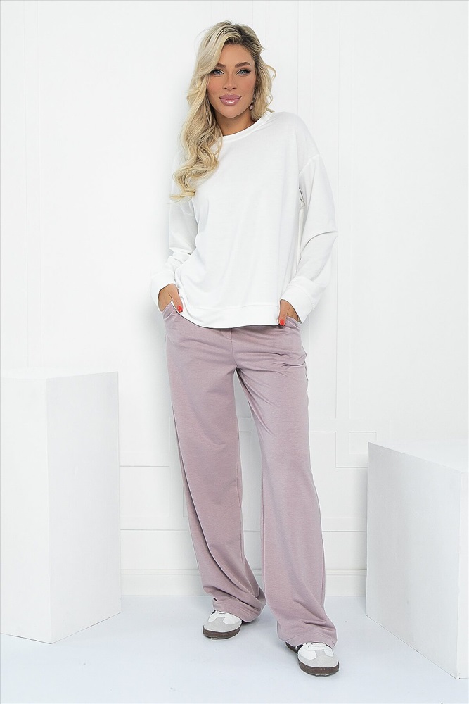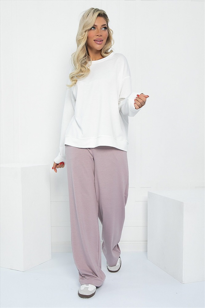 Артикул: К12952-25М. Тип ткани: смесовый. Состав: 65% полиэстер, 30% вискоза, 5% эластан. Материал: трикотаж "Футер 2-х нитка". Цвет: бело-лиловый. Принт: отсутствует. Вид застежки: без застёжки. Карманы: есть. Резинка в поясе: есть. Силуэт: оверсайз. Декоративные элементы: отсутствуют. Длина верха по спинке от верхней точки плеча: 44/ 62 см, 46/ 65 см, 48-50/ 67 см. Длина брюк по боковому шву: 44/ 104 см, 46/ 105 см, 48/ 106 см, 50/ 107 см. Размер изделия на модели: 44 Рост модели: 170 см.