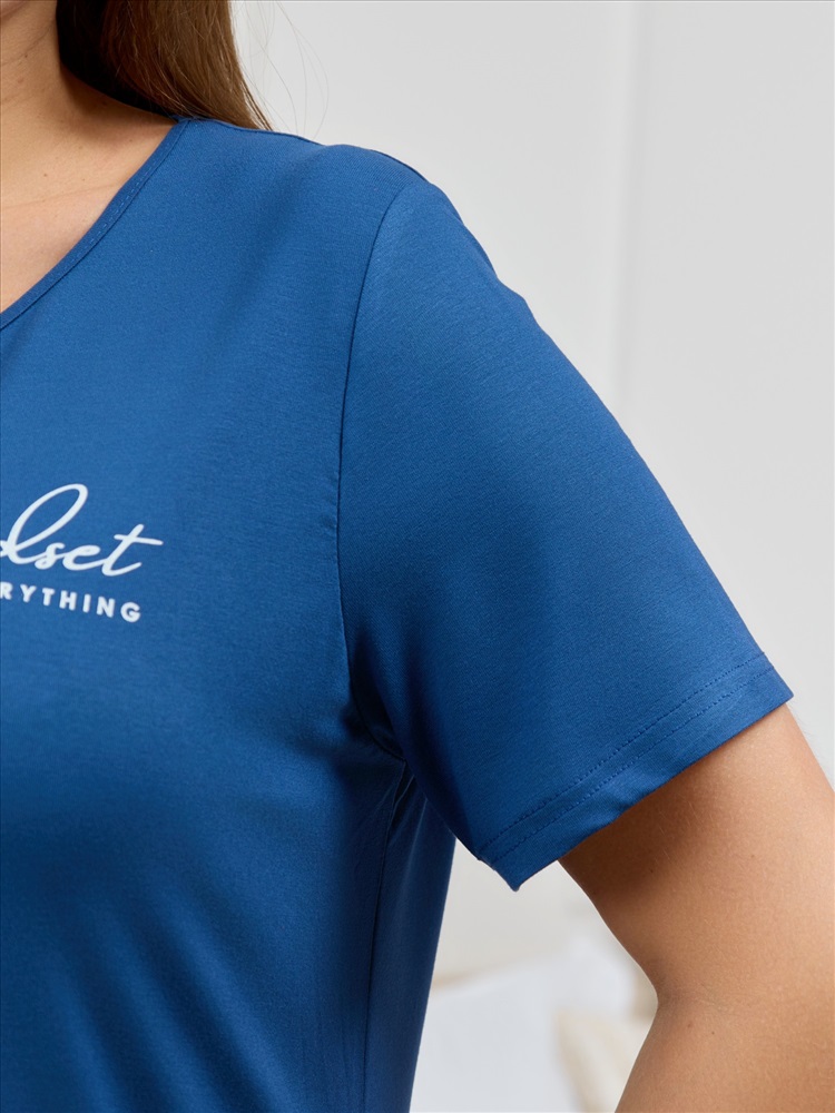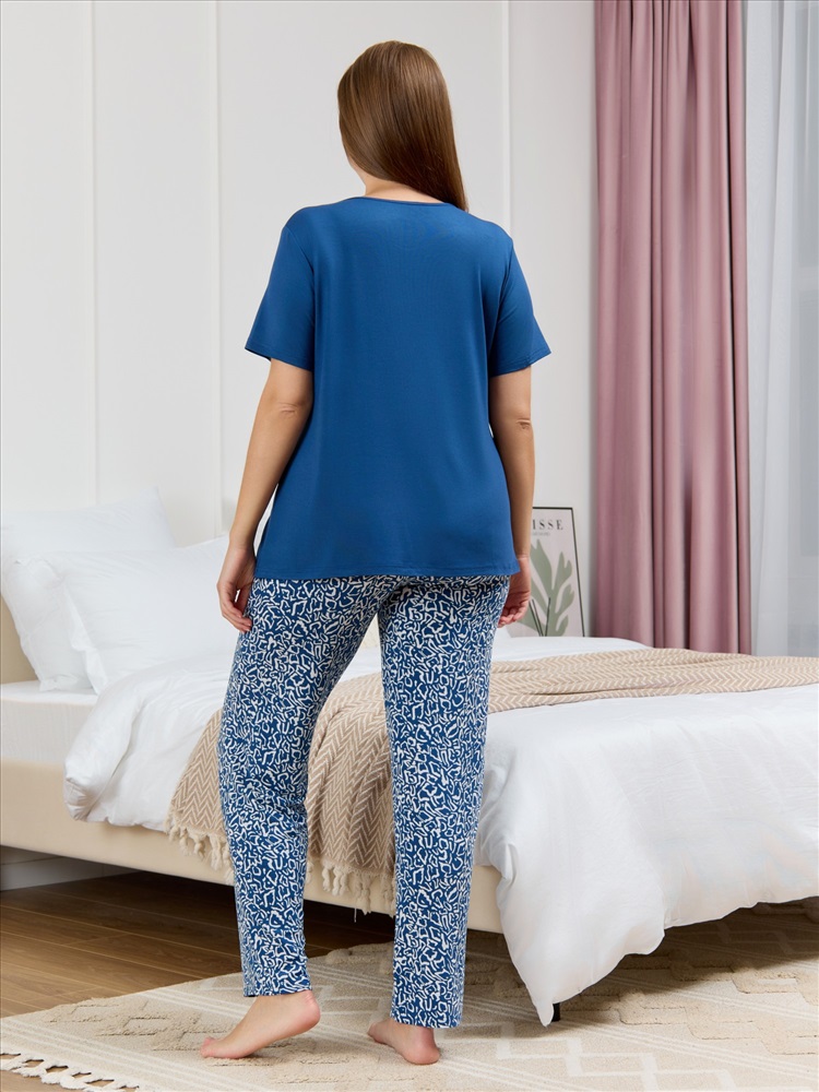 Костюм женский из трикотажного вискозного полотна в комбинации двух видов тканей: гладкокрашеной и с набивным рисунком, состоящий из футболки и брюк. Футболка – из гладкокрашеного полотна с короткими втачными рукавами, V-образной горловиной, окантованной основным материалом и принтом на полочке, выполненным в технике «шелкографии».Брюки — из полотна с набивным рисунком, прилегающего силуэта, с эластичной тесьмой по талии.