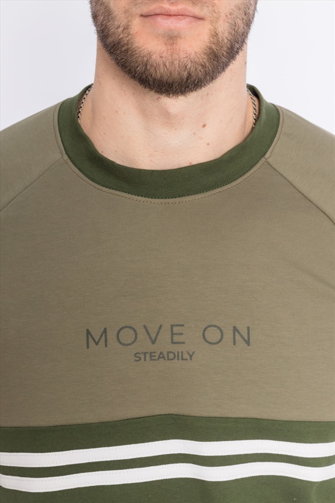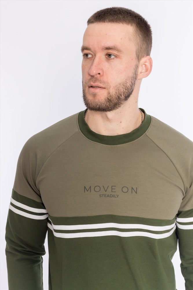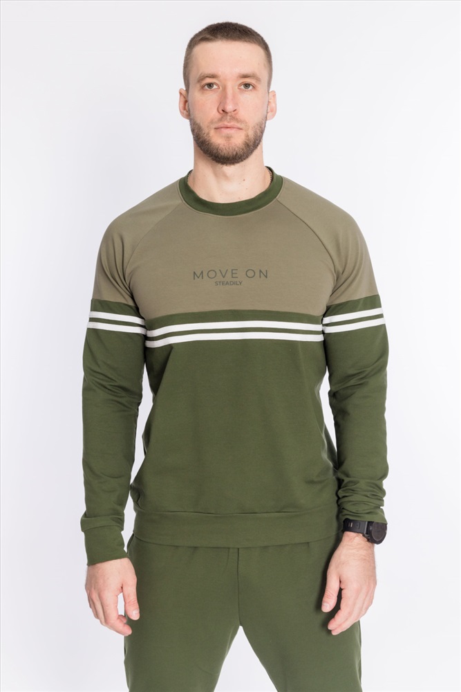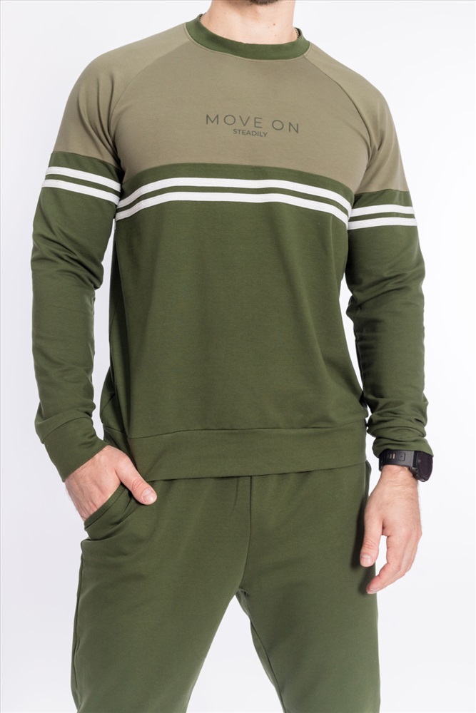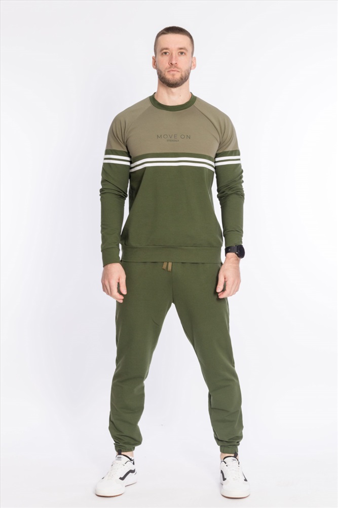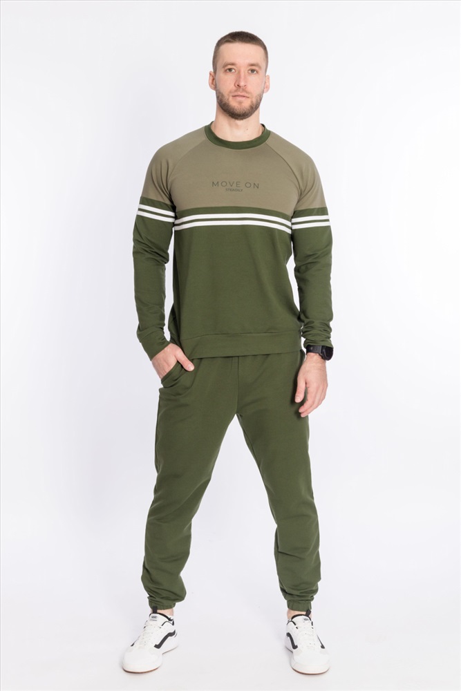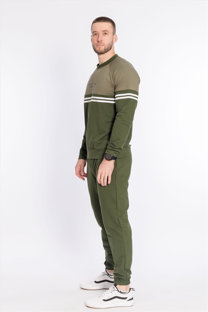 Застежка: Без застежки С капюшоном: Нет С карманами: Нет Сезон: Всесезонный Состав: Хлопок 95% Лайкра 5% Цвет Номенклатуры: хаки Костюм выполнен из однотонного футера с лайкрой. Костюм состоит из брюк и толстовки. Толстовка с рукавом реглан, притачным поясом и манжетами. На толстовке в качестве отделки лампасы и принт. Брюки с притачным поясом на резине и шнуре. Низ брюк собран на резинку, по бокам размещены карманы. Комментарии к товару