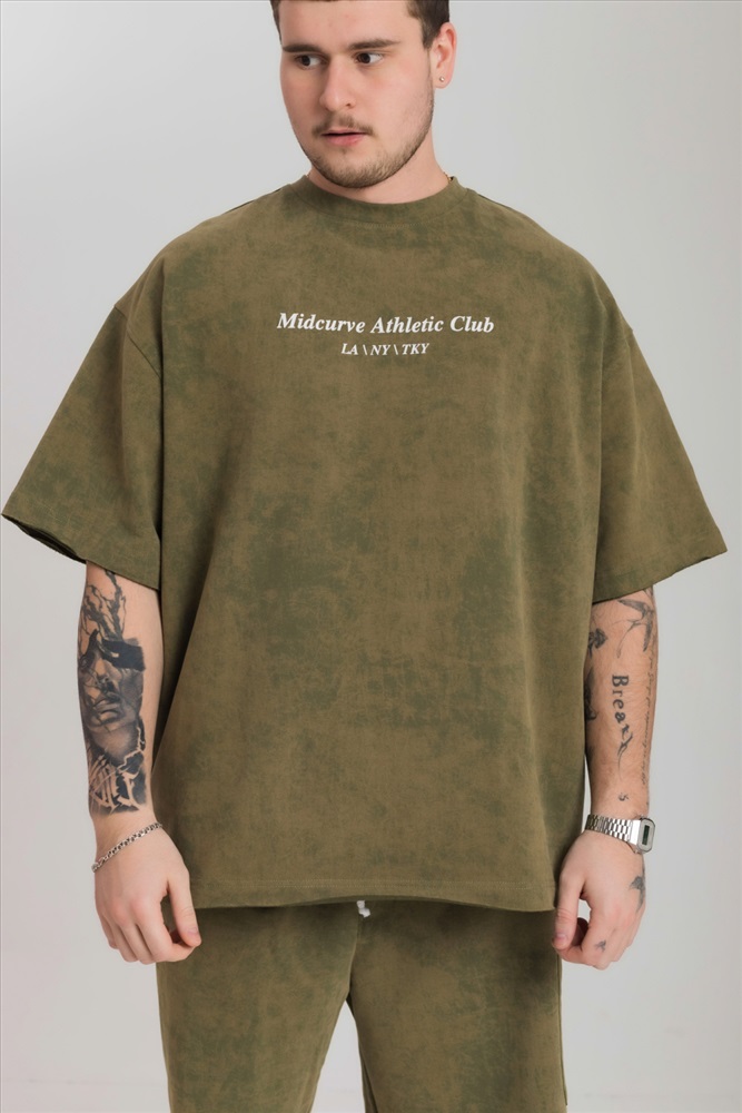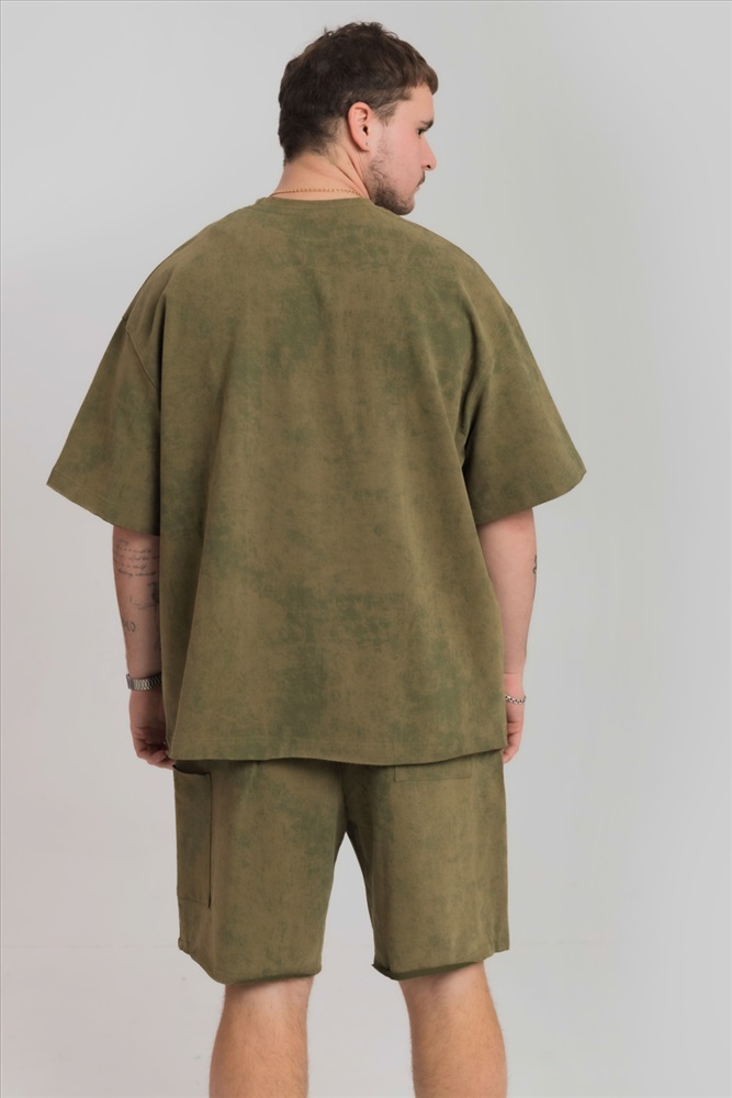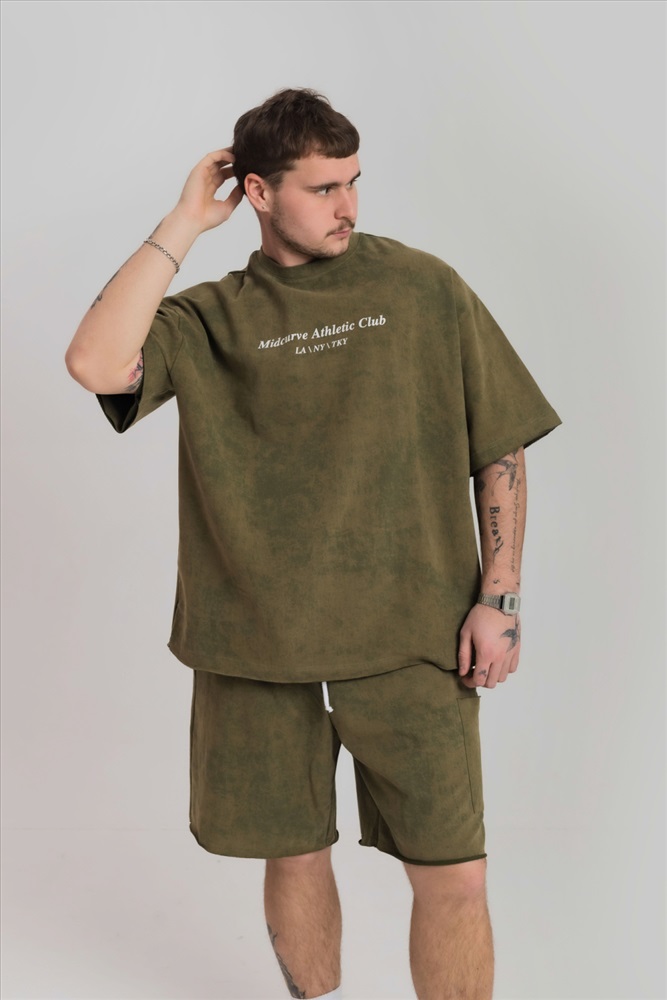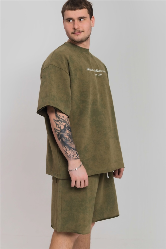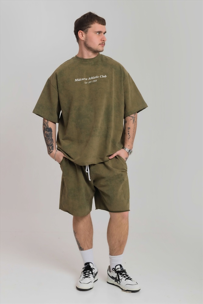 Застежка: Без застежки С капюшоном: Нет С карманами: Да Сезон: Всесезонный Состав: Хлопок 95% Лайкра 5% Цвет Номенклатуры: хаки Костюм из футера петля набивка состоит из шорт и футболки. Шорты с притачным поясом с резинкой и со шнуром, с боковыми карманами и накладными карманами: один на правой задней половинке, другой на левом боковом шве. верх карманов и шорт необработан. Футболка с коротким рукавом легкий оверсайз. Низ рукавов и футболки распошит и обрезан. На полочке принт. Комментарии к товару
