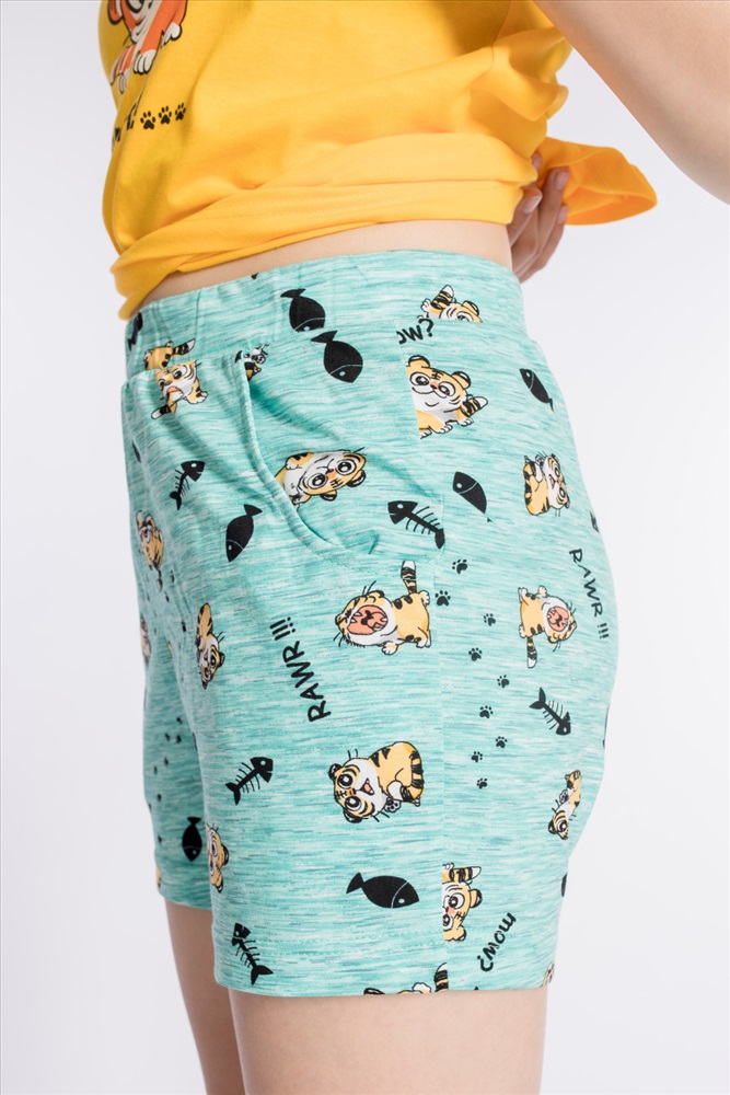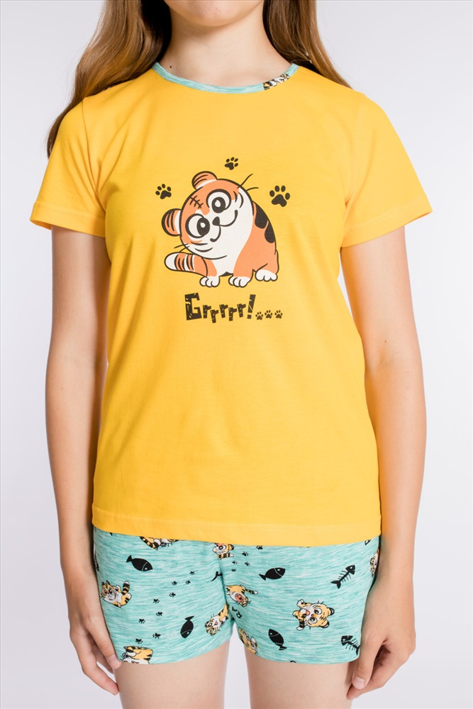 Костюм выполнен из х/б полотна, состоит из футболки и шорт. Футболка с круглым вырезом горловины, обработанным бейкой. Спереди нанесён принт. Шорты с поясом на резине, по бокам расположены карманы.