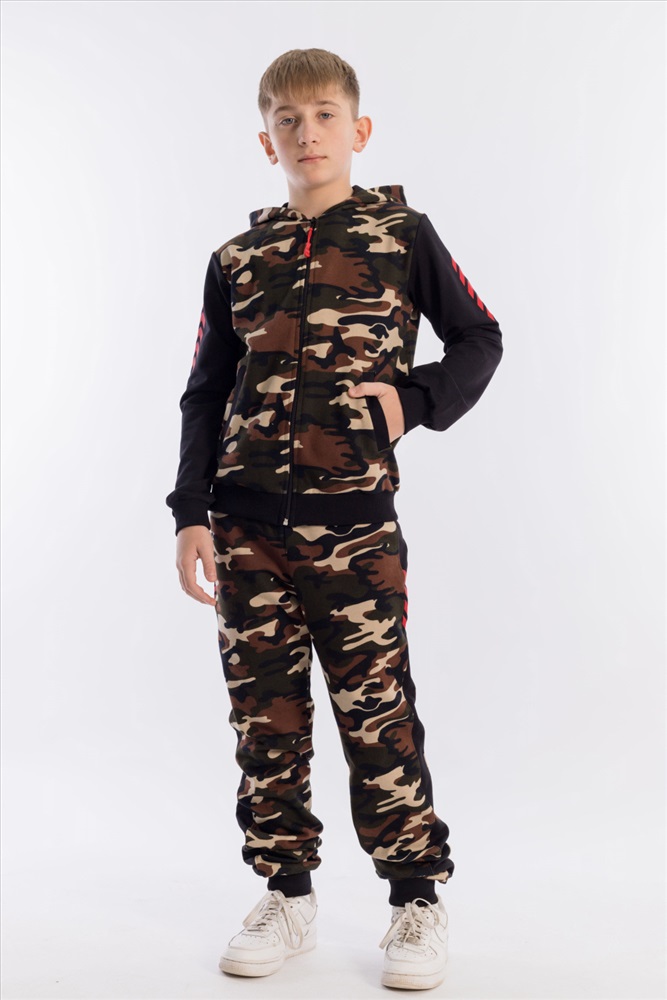 Застежка: Молния С капюшоном: Да С карманами: Да Сезон: Зимний Состав: Хлопок 80% Полиэстер 20% Цвет Номенклатуры: хаки Спортивный костюм из полотна футер трёхнитка (воздушка), состоит из толстовки с застёжкой на молнии и брюк. Толстовка с капюшоном и двумя карманами спереди. Пояс брюк и толстовки, манжеты рукавов и брюк выполнены из кашкорсе. Брюки с поясом на резине и шнуре. На вставках брюк и рукавах нанесены термопринты. Комментарии к товару