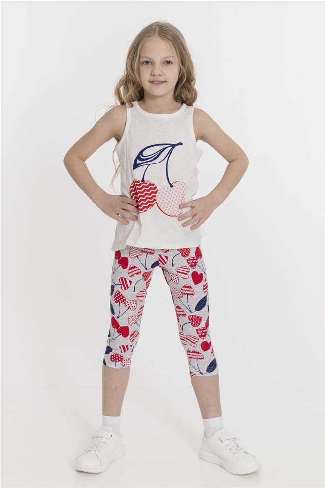 Застежка: Без застежки С капюшоном: Нет С карманами: Нет Сезон: Летний Состав: Хлопок 95% Лайкра 5% Цвет Номенклатуры: экрю Костюм для девочек выполнен из двух видов полотна - майка из кулирки фламли, а капри из х/б полотна с содержанием лайкры. Майка с круглым вырезом горловины и принтом спереди, низ разноуровневый. Капри с поясом на резине. Комментарии к товару