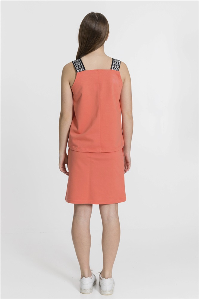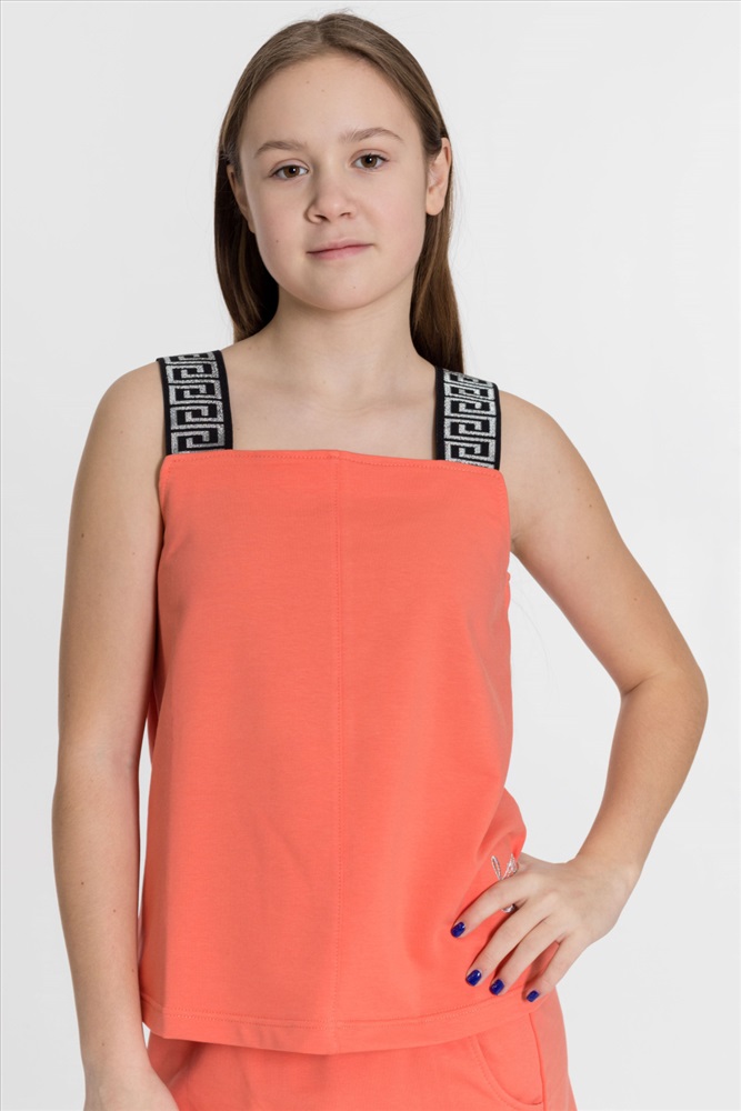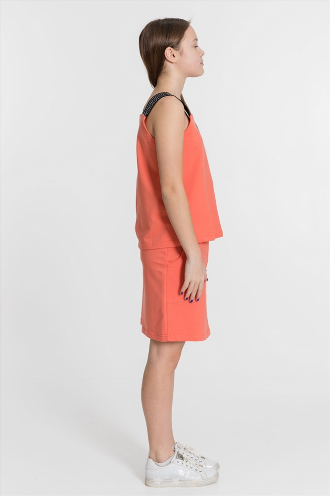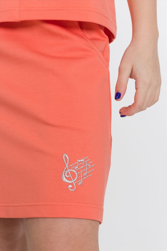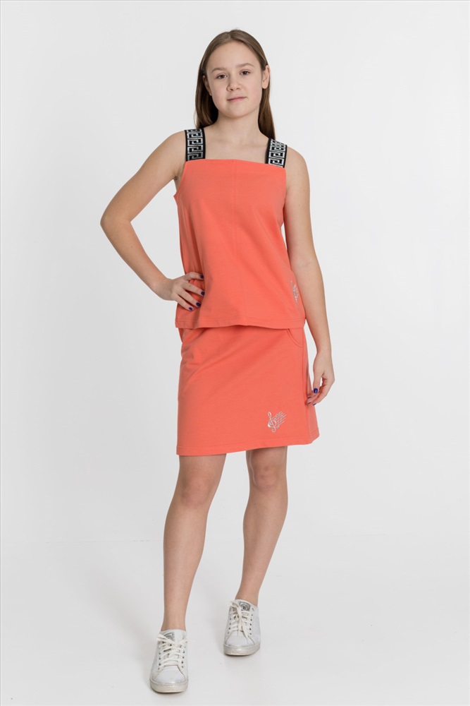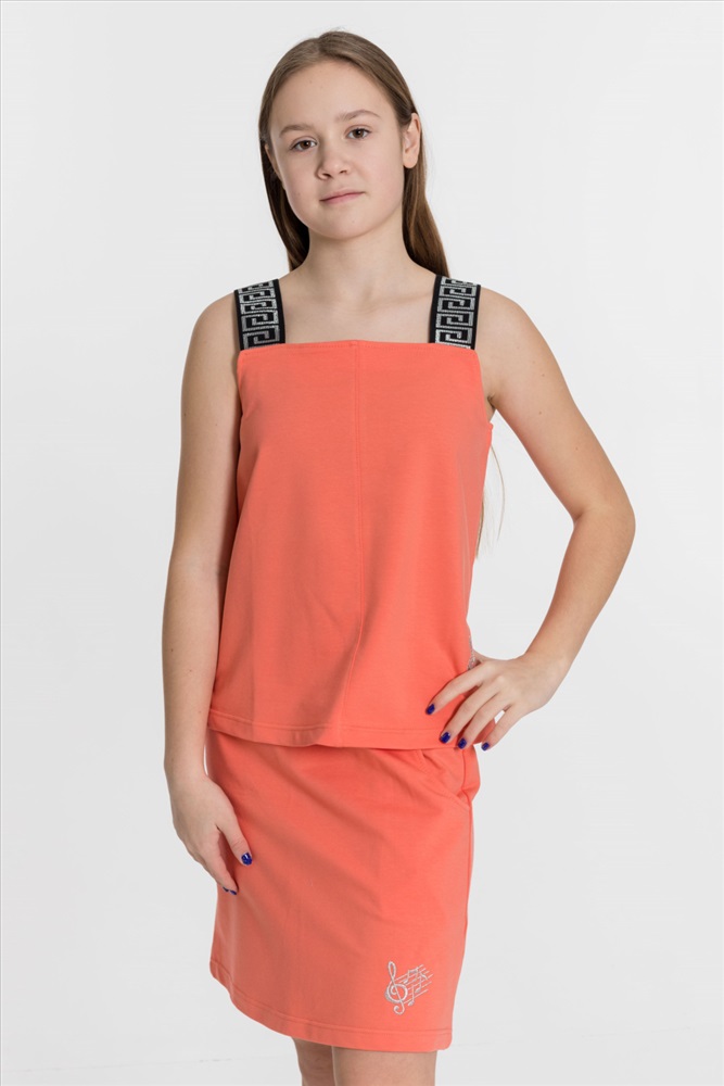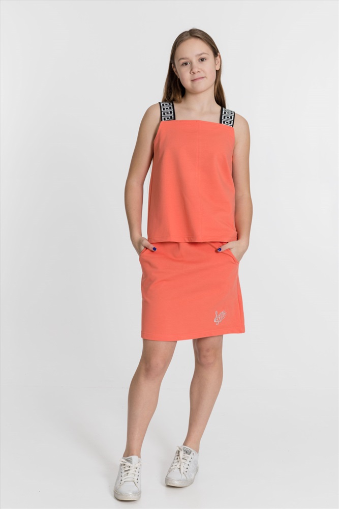 С капюшоном: Нет С карманами: Да Сезон: Летний Состав: Хлопок 95% Лайкра 5% Цвет Номенклатуры: коралловый Костюм выполнен из однотонного футера с лайкрой, состоит из юбки и топа. Юбка прямая, с боковыми карманами и поясом на резине. Топ слегка расклешенный, с декоративными бретелями. На топе и юбке вышивка. Комментарии к товару