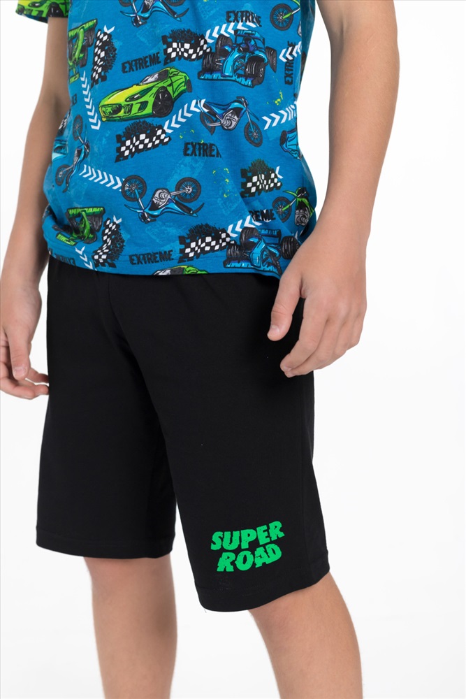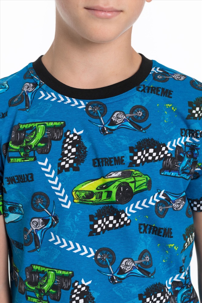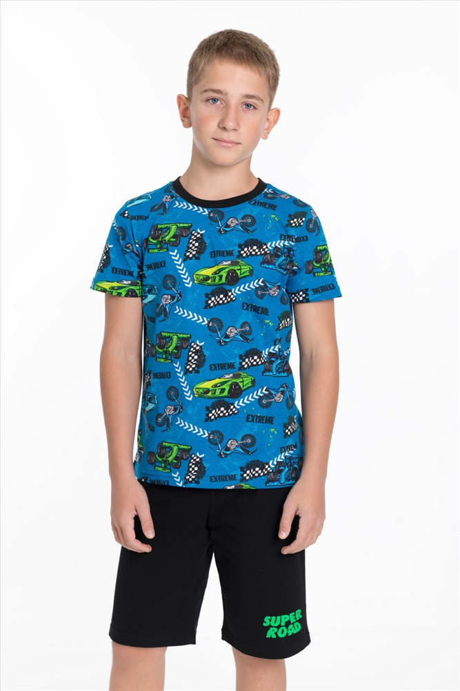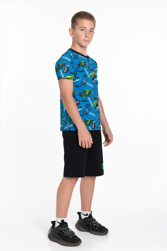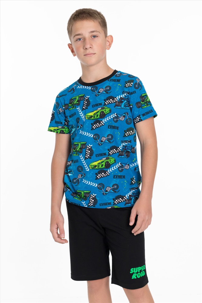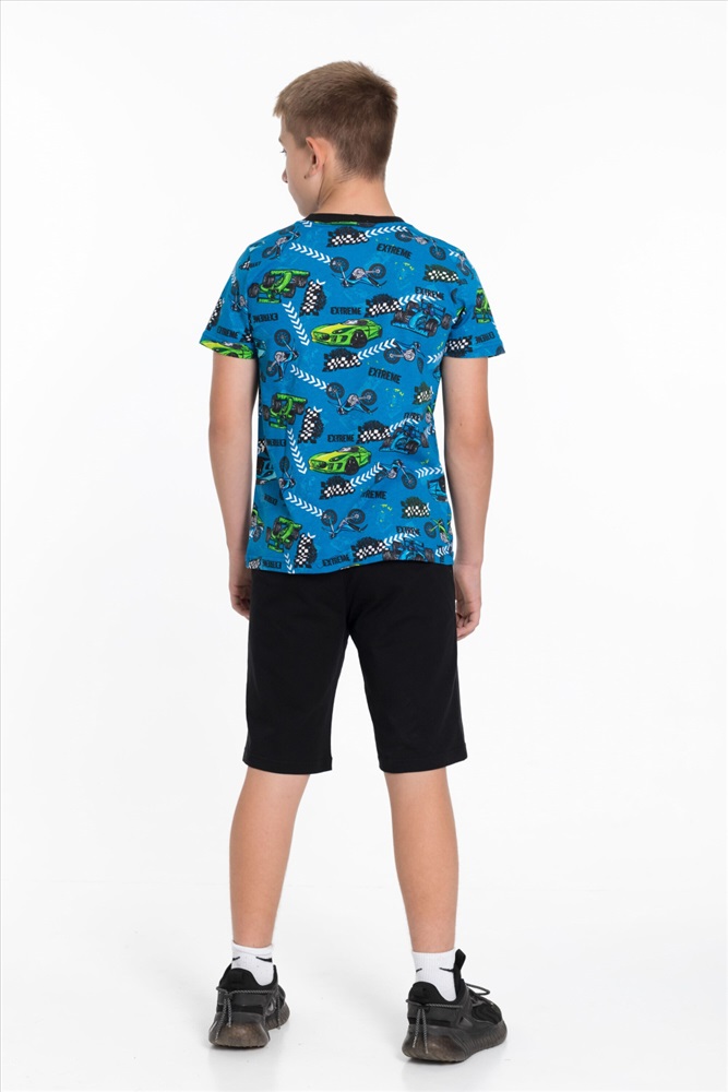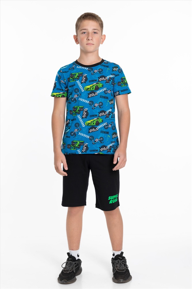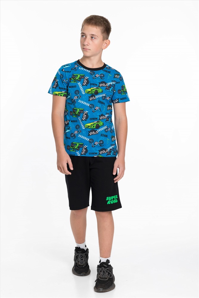 Застежка: Без застежки С капюшоном: Нет С карманами: Нет Сезон: Летний Состав: Хлопок 100% Цвет Номенклатуры: синий Костюм для мальчика изготовлен из кулирки реактив, что делает его комфортным и приятным на ощупь. Состоит из футболки и шорт, идеального варианта для активных игр и занятий на свежем воздухе. Футболка с коротким рукавом и круглым вырезом горловины обеспечивает комфорт и свободу движений. Шорты средней длины, свободного кроя и поясом на резинке также обеспечивают комфорт и удобство во время носки. Спереди нанесен принт, который придает изделию стильный и яркий вид. Такой костюм идеально подойдет для повседневного использования, прогулок, спортивных мероприятий или активных игр. Комментарии к товару