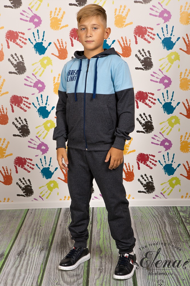 Костюм выполнен из футер петли с лайкрой. Толстовка с капюшоном и застёжкой на молнии, ширина капюшона регулируется при помощи шнура. На толстовке по бокам размещены карманы, пояс и манжеты на рукавах и брюках из кашкорсе. На толстовке и брюках нанесён принт.