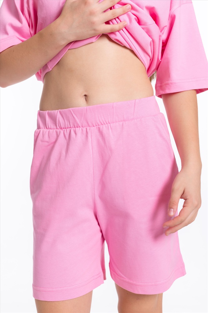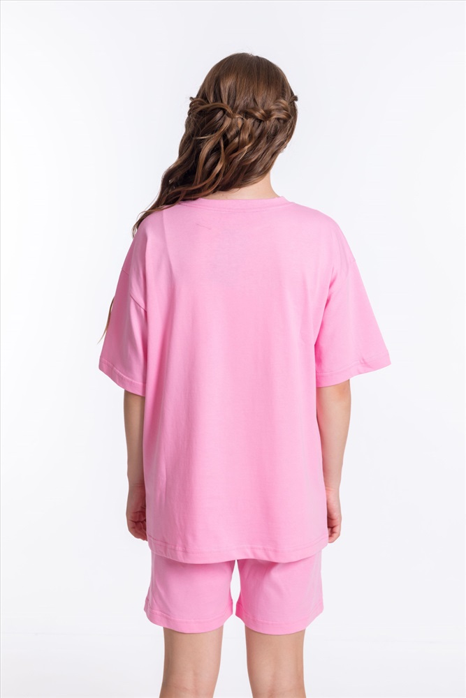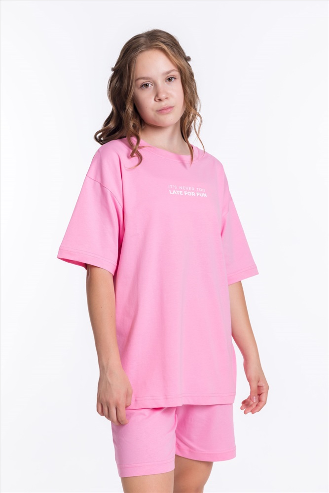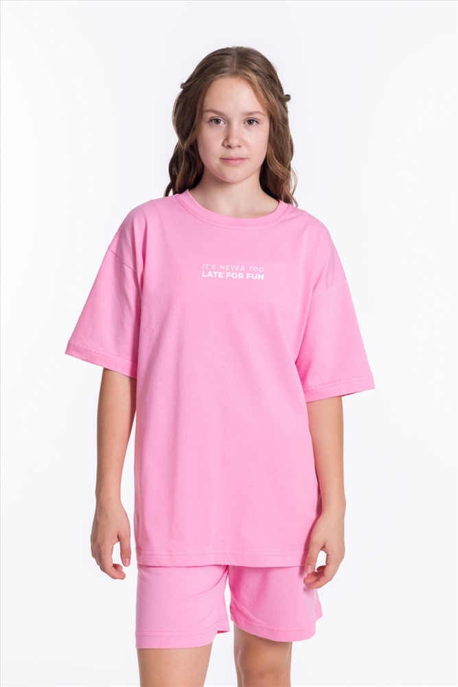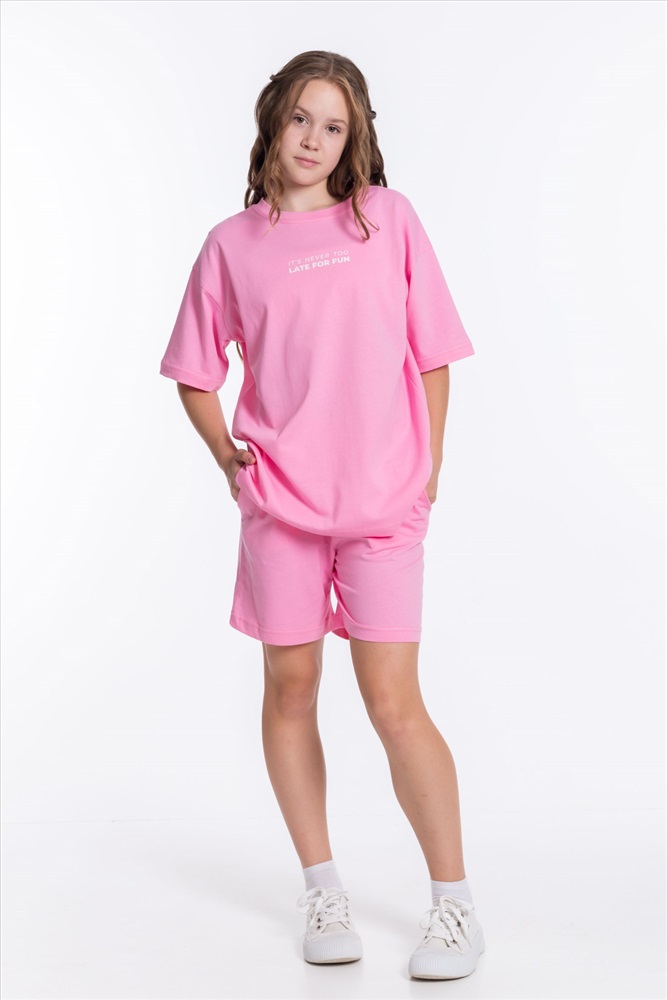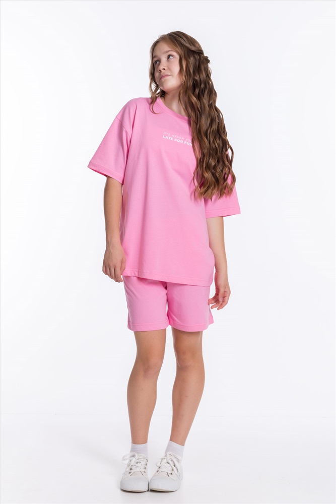 Застежка: Без застежки С капюшоном: Нет С карманами: Нет Сезон: Летний Состав: Хлопок 100% Цвет Номенклатуры: розовый Модный костюм для девочки выполнен из мягкой и приятной к телу ткани — кулирки (100% хлопок). Он состоит из свободных шорт и футболки, что обеспечивает комфорт и свободу движений. Футболка имеет короткий втачной рукав и украшена принтом спереди. Шорты слегка расширены, есть боковые карманы и притачной пояс на резинке. Костюм выполнен в однотонном розовом цвете, что позволяет сочетать его с различными элементами гардероба. Комментарии к товару