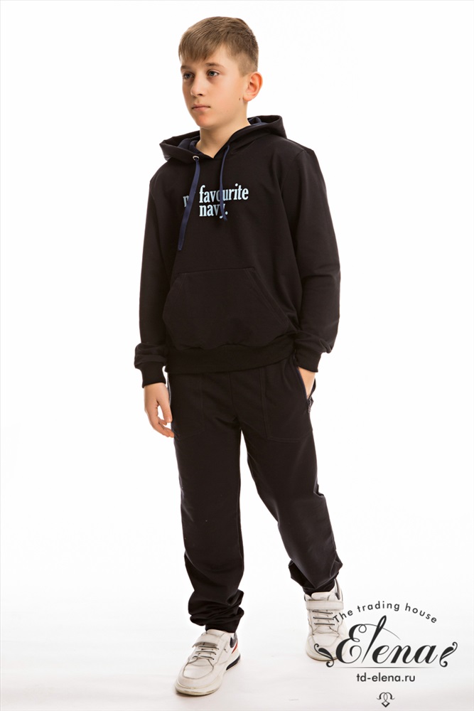 Застежка: Без застежки С капюшоном: Нет С карманами: Да Сезон: Всесезонный Состав: Хлопок 95% Лайкра 5% Цвет Номенклатуры: синий Костюм выполнен из футера с лайкрой. Толстовка с капюшоном, карманом-кенгуру, притачным поясом и манжетами из кашкорсе. Спереди на толстовке нанесён принт. Брюки с поясом на резине и шнуре, манжетами из основного полотна и карманами на молнии по бокам. Комментарии к товару