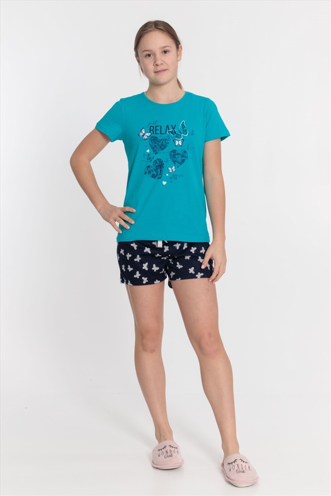 Застежка: Без застежки С капюшоном: Нет С карманами: Нет Сезон: Летний Состав: Хлопок 80% Полиэстер 20% Цвет Номенклатуры: бирюзовый Летний костюм состоит из футболки с принтом и шорт. Футболка из кулирки, с коротким рукавом, круглый вырез горловины обработан бейкой. Шорты выполнены из полотна академик с набивным рисунком, пояс на резине и шнуре, по бокам с карманами. Комментарии к товару
