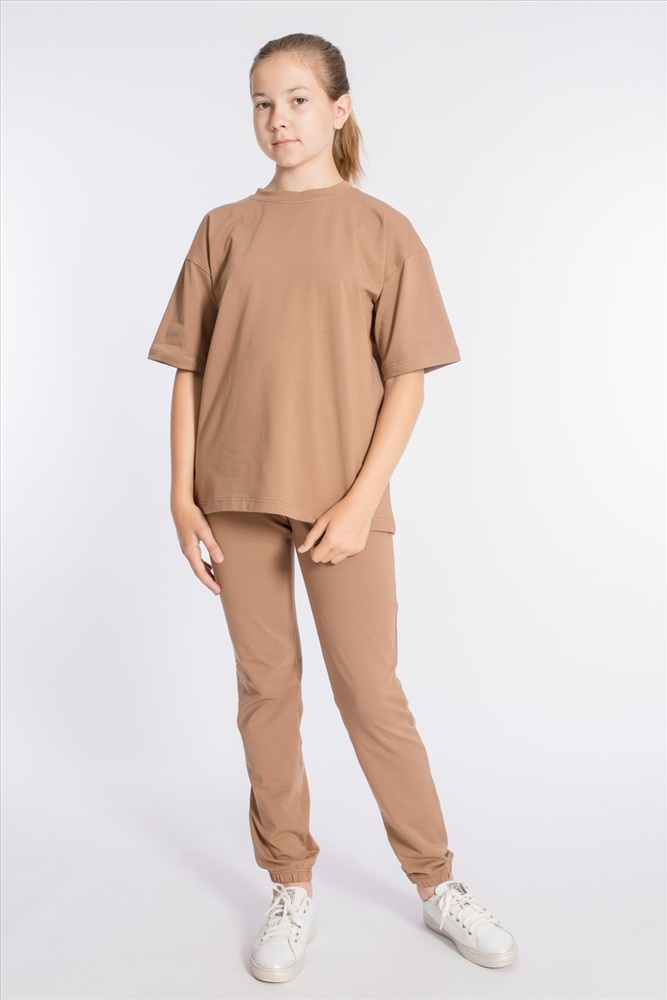 Застежка: Без застежки С капюшоном: Нет С карманами: Нет Сезон: Всесезонный Состав: Хлопок 95% Лайкра 5% Цвет Номенклатуры: бежево-коричневый Костюм выполнен из однотонной кулирки с лайкрой, состоит из футболки и брюк. Футболка свободного силуэта, со спущенной линией плеча. Пояс и низ брюк на резине. Комментарии к товару