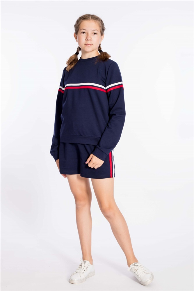 Застежка: Без застежки С капюшоном: Нет С карманами: Нет Сезон: Летний Состав: Хлопок 95% Лайкра 5% Цвет Номенклатуры: синий Костюм выполнен из футер петли с лайкрой, состоит из толстовки и шорт. Толстовка с длинным рукавом и круглым вырезом горловины, оформленным кашкорсе. Шорты с поясом на резине. Спереди на толстовке, рукавах и по бокам шорт отделка лампасами двух цветов. Комментарии к товару