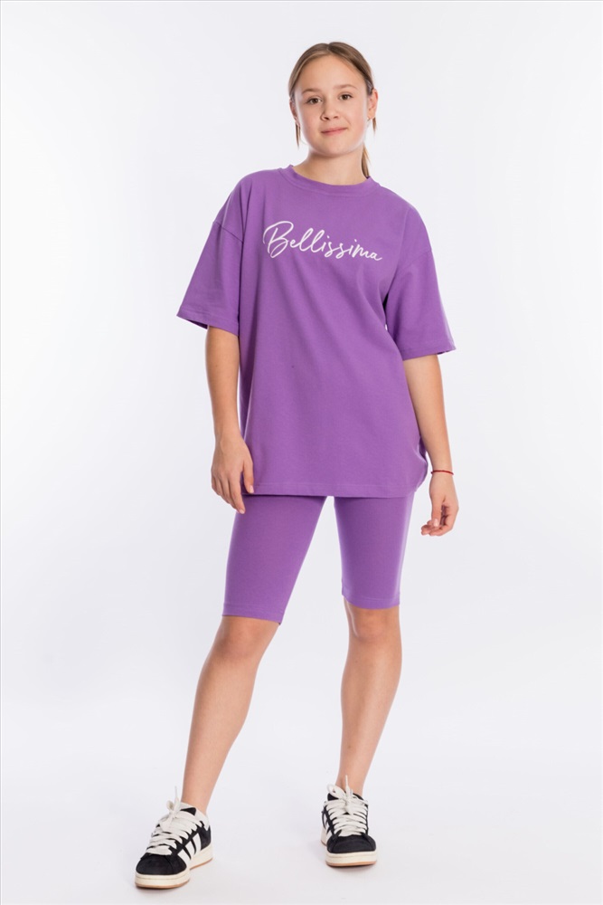 Костюм выполнен из однотонной кулирки с лайкрой, состоит из футболки свободного силуэта и велосипедок. Футболка с коротким втачным рукавом и принтом спереди. Велосипедки с притачным поясом на резине.