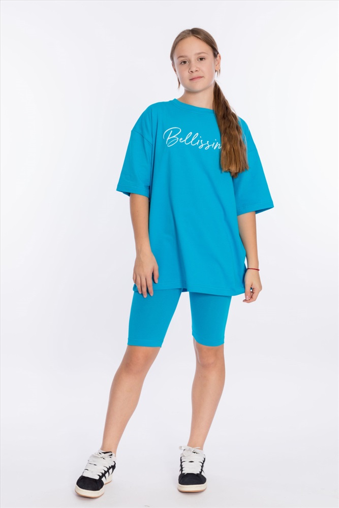 С капюшоном: Нет С карманами: Нет Сезон: Летний Состав: Хлопок 95% Лайкра 5% Цвет Номенклатуры: бирюзовый Костюм выполнен из однотонной кулирки с лайкрой, состоит из футболки свободного силуэта и велосипедок. Футболка с коротким втачным рукавом и принтом спереди. Велосипедки с притачным поясом на резине. Комментарии к товару
