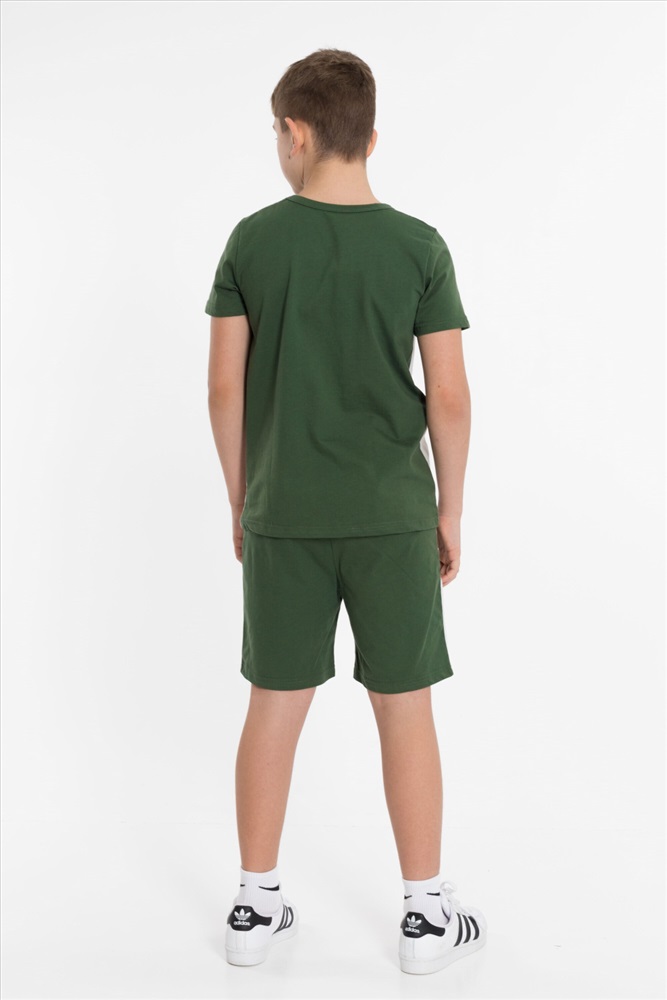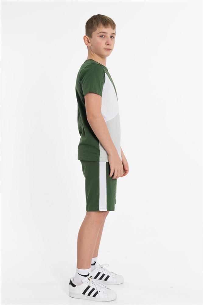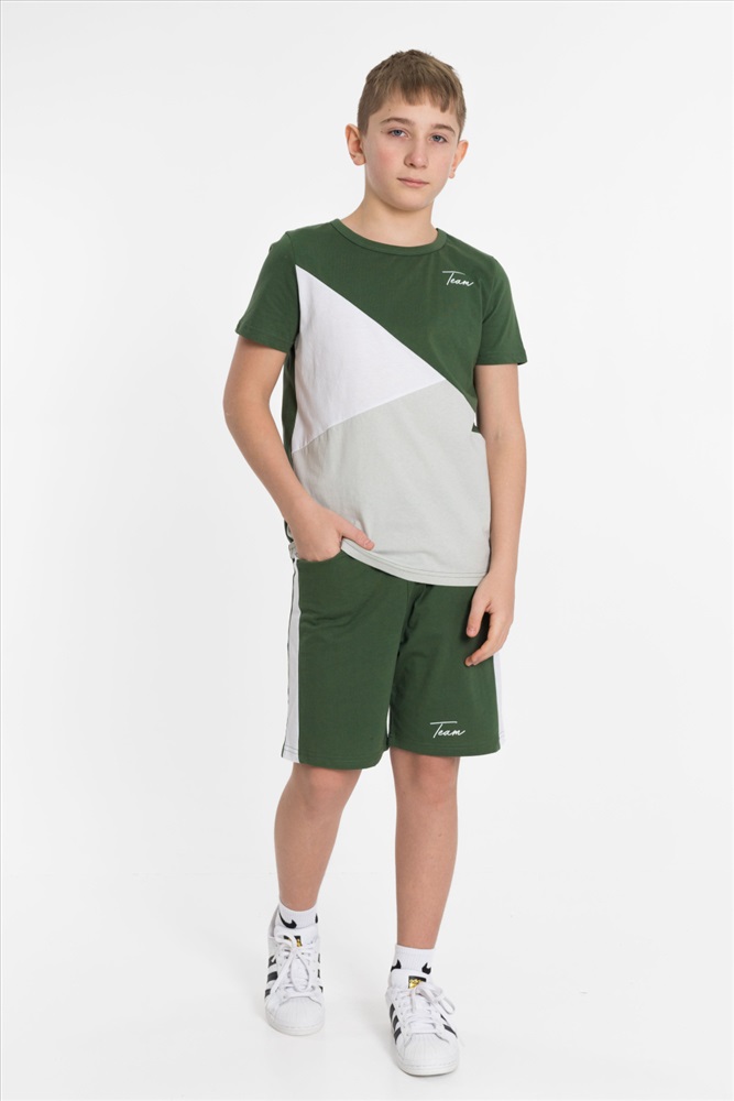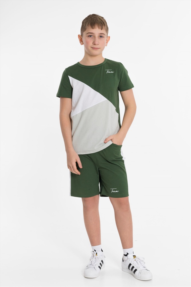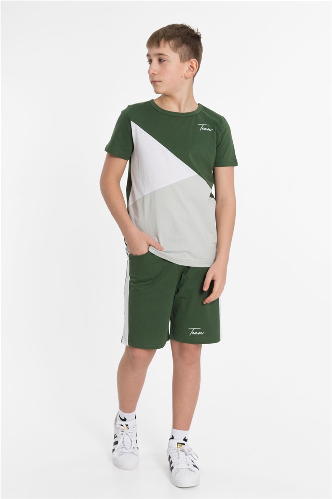 Цвет Номенклатуры: хаки Костюм выполнен из хлопкового полотна, состоит из футболки и шорт. Футболка прямого силуэта, круглый вырез горловины оформлен бейкой, рукав короткий. С левой стороны нанесён принт. Шорты с принтом, поясом на резинке и карманами по бокам.