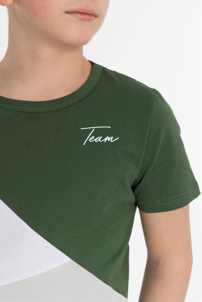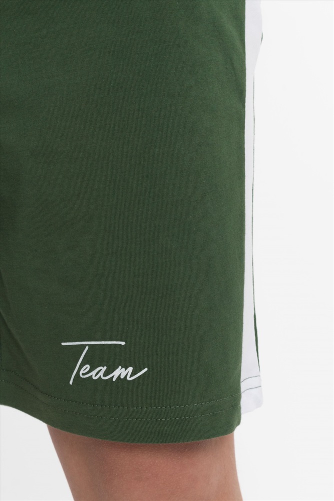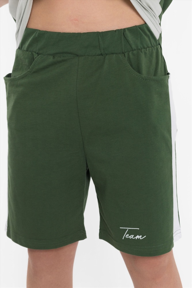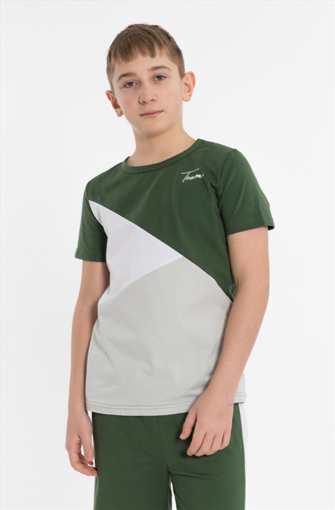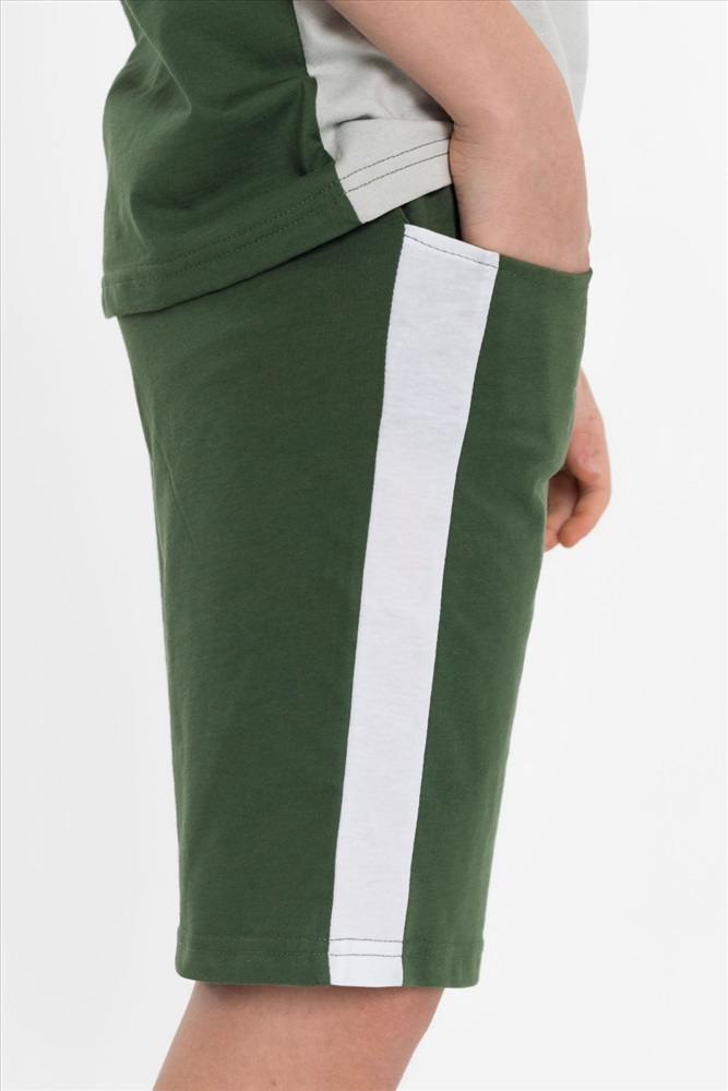 Цвет Номенклатуры: хаки Костюм выполнен из хлопкового полотна, состоит из футболки и шорт. Футболка прямого силуэта, круглый вырез горловины оформлен бейкой, рукав короткий. С левой стороны нанесён принт. Шорты с принтом, поясом на резинке и карманами по бокам.