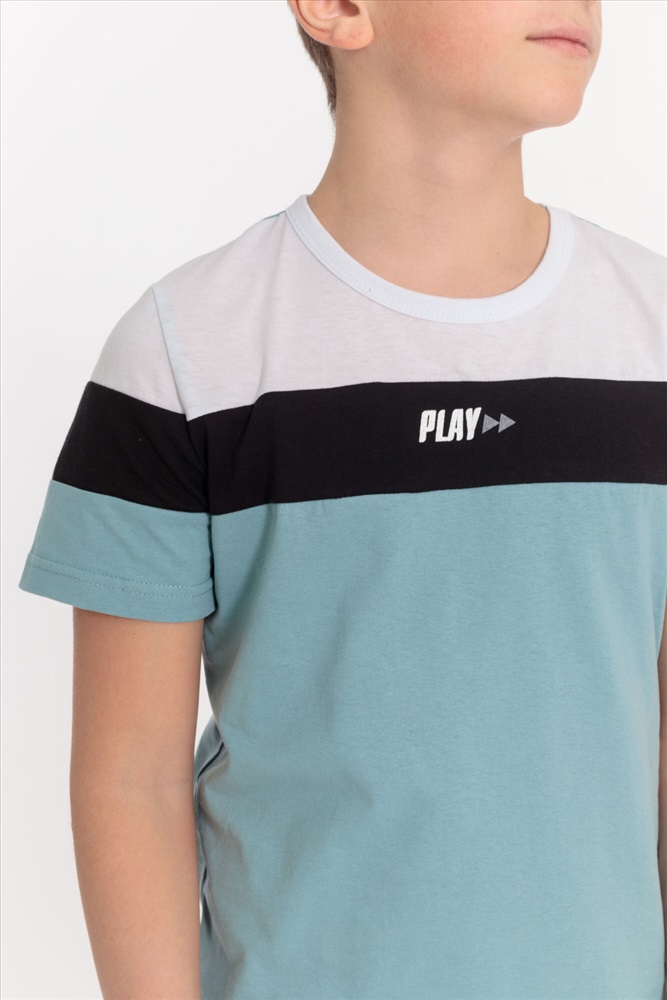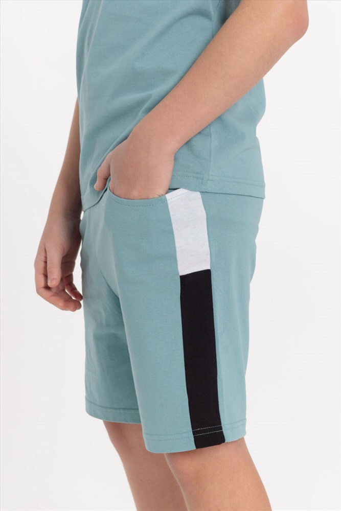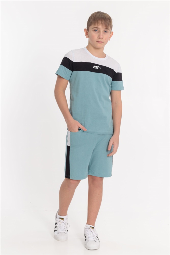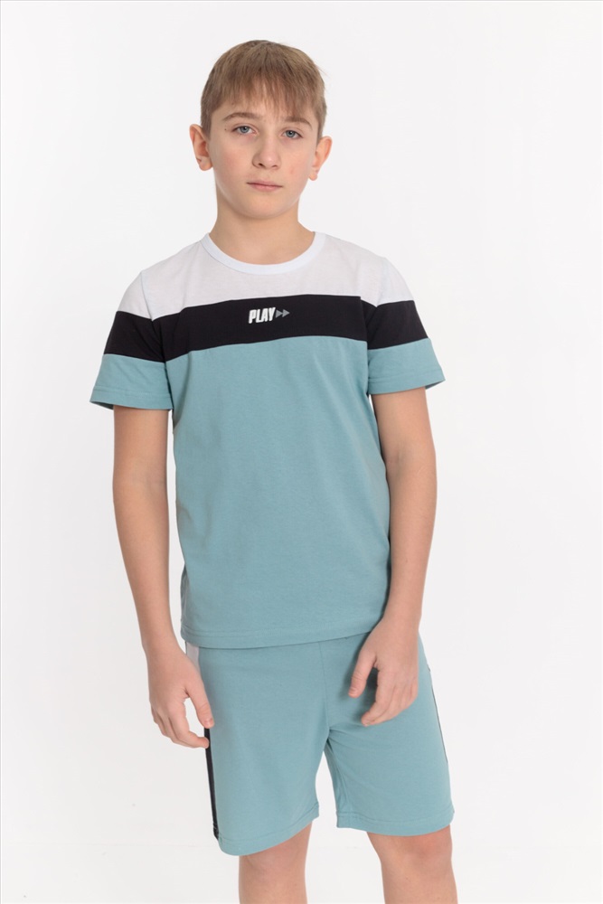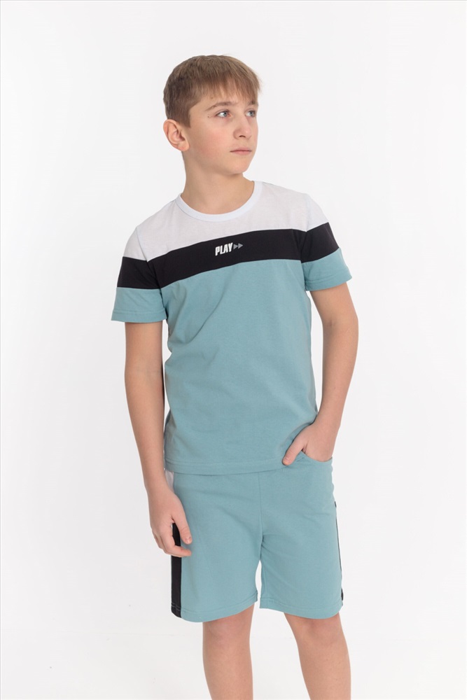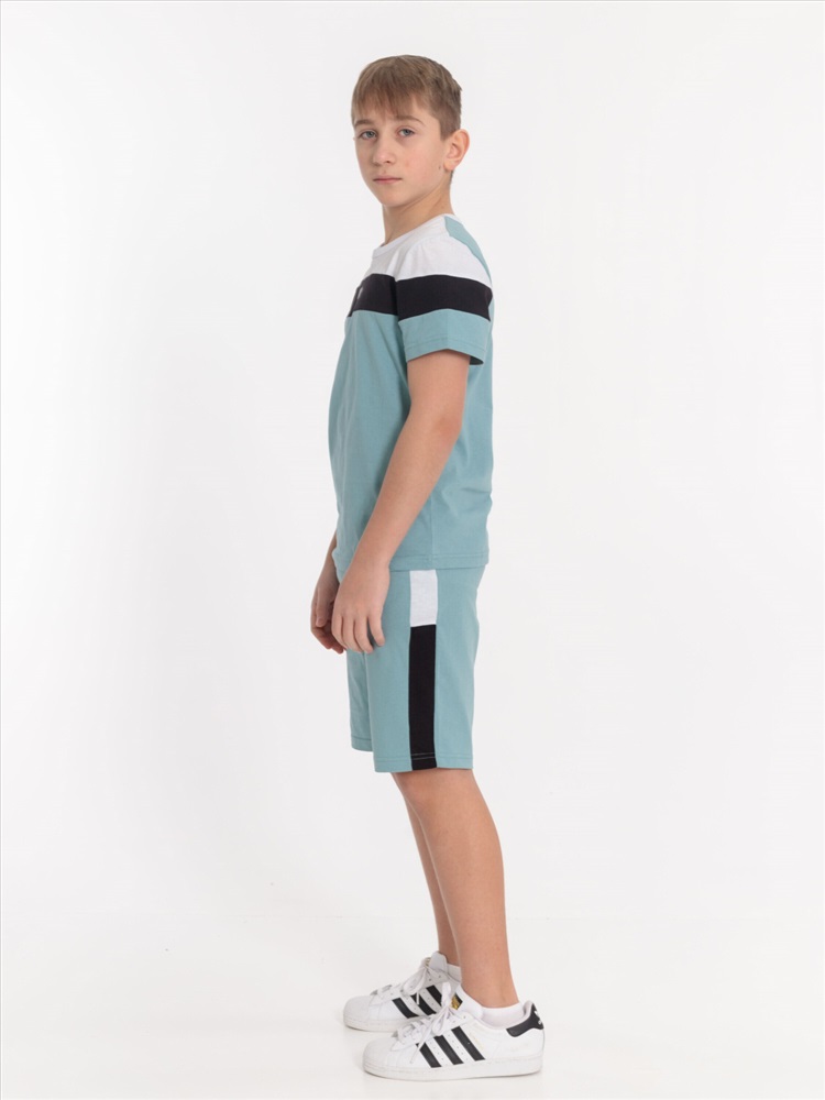 Костюм для мальчика выполнен из кулирки, состоит из футболки и шорт. Футболка с круглым вырезом горловины и принтом спереди. Шорты с поясом на резинке.