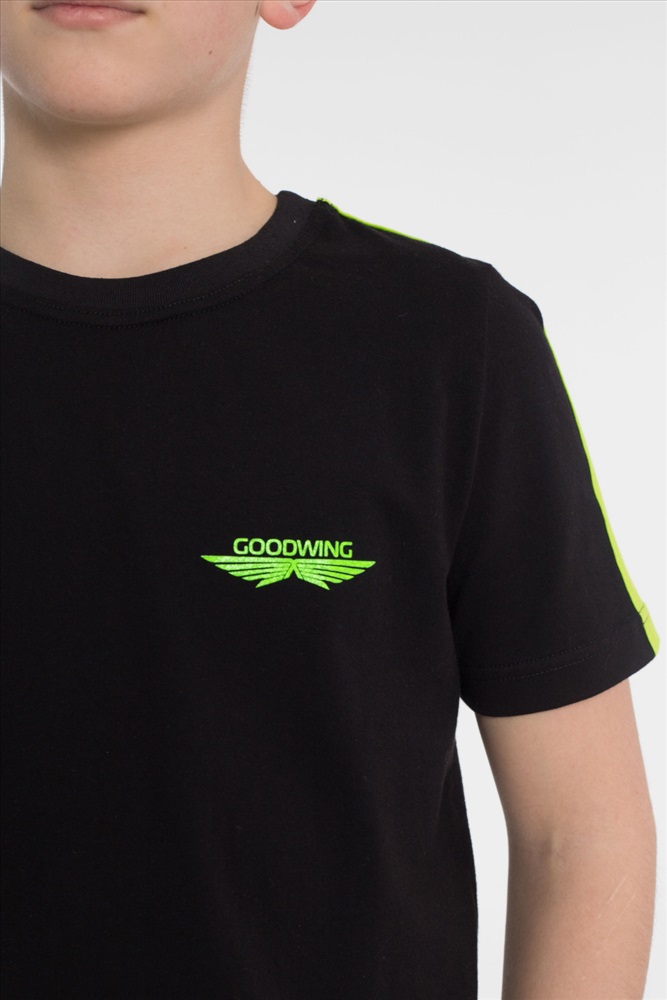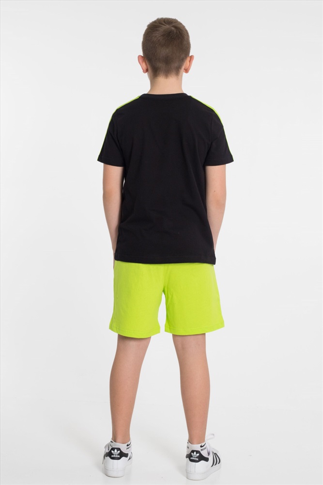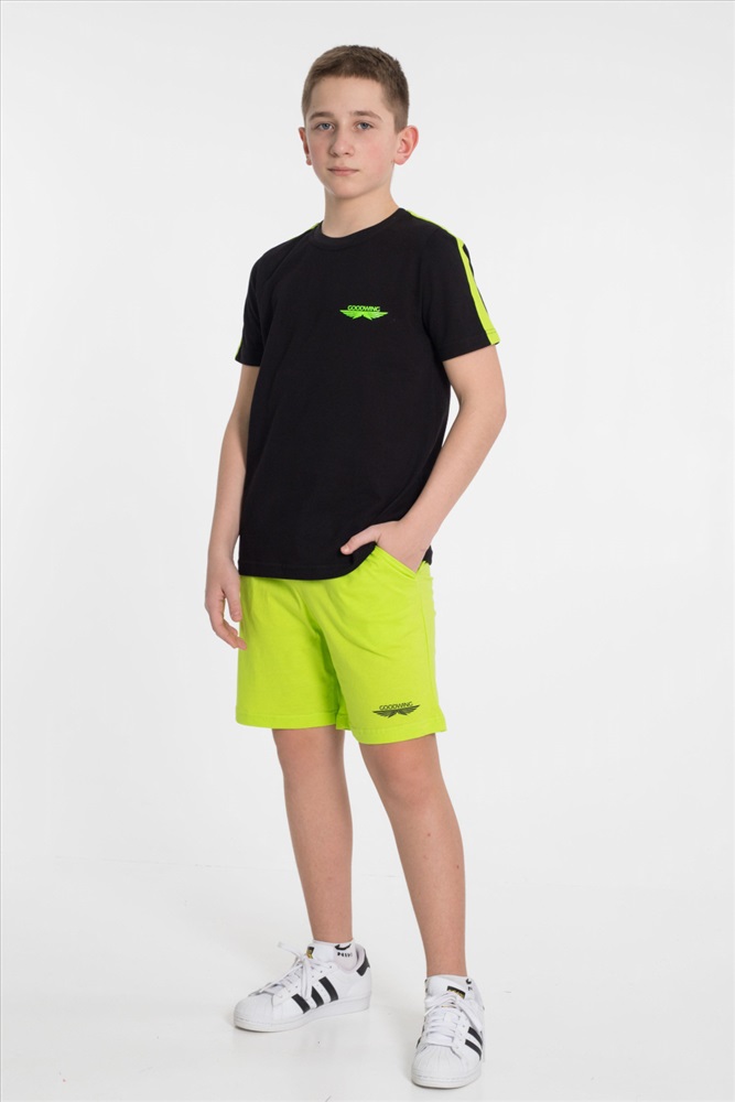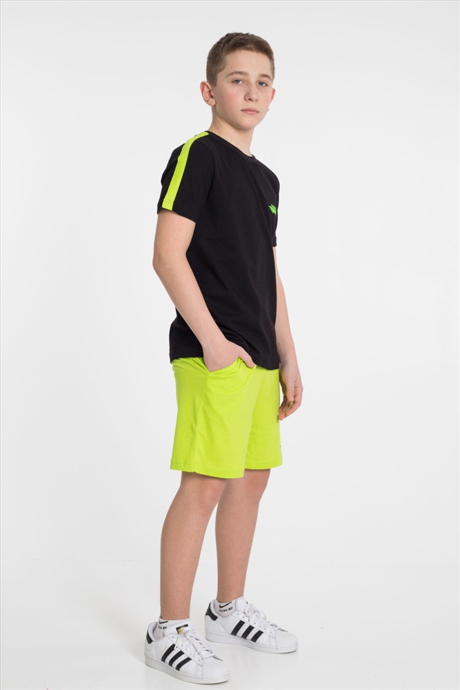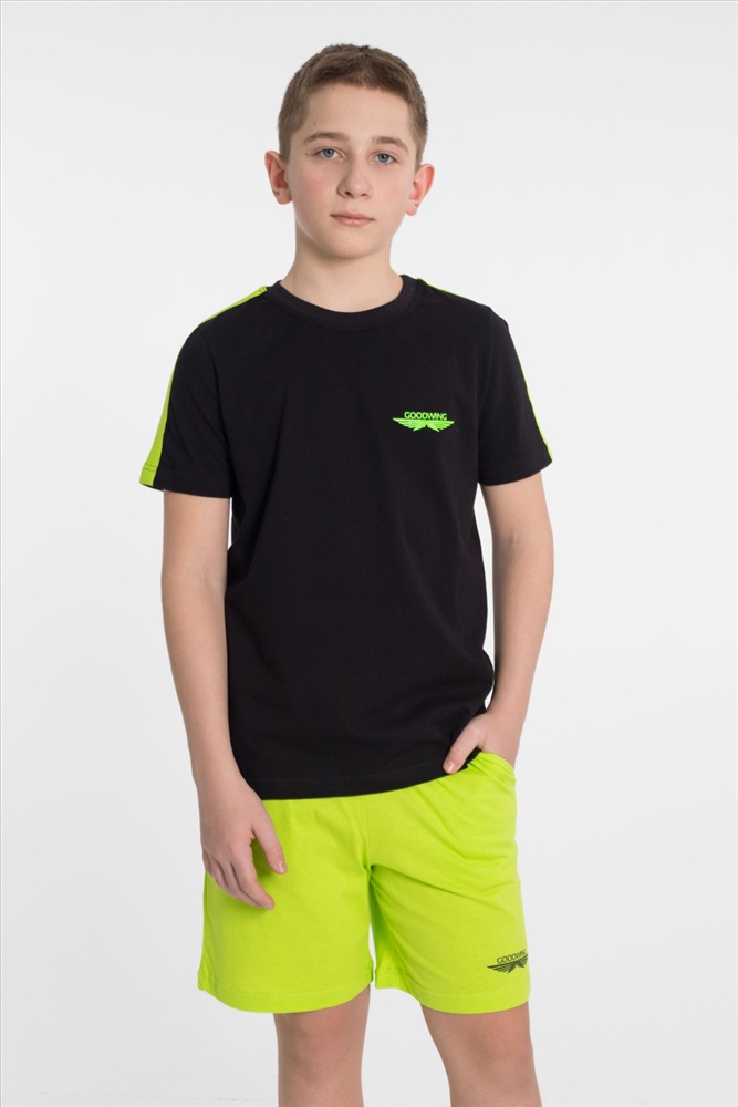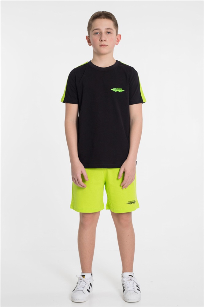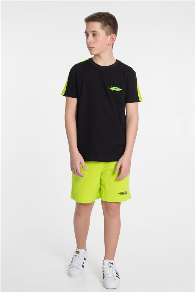 Застежка: Без застежки С капюшоном: Нет С карманами: Нет Сезон: Летний Состав: Хлопок 100% Цвет Номенклатуры: черный Костюм из однотонной кулирки 2-х цветов. Шорты - свободные с боковыми карманами и притачным поясом. Футболка - короткий втачной рукав, круглый вырез горловины. На полочке футболки и на левой передней половинке шорт принт. По плечевым участкам футболки широкие лампасы в цвет шорт. Комментарии к товару