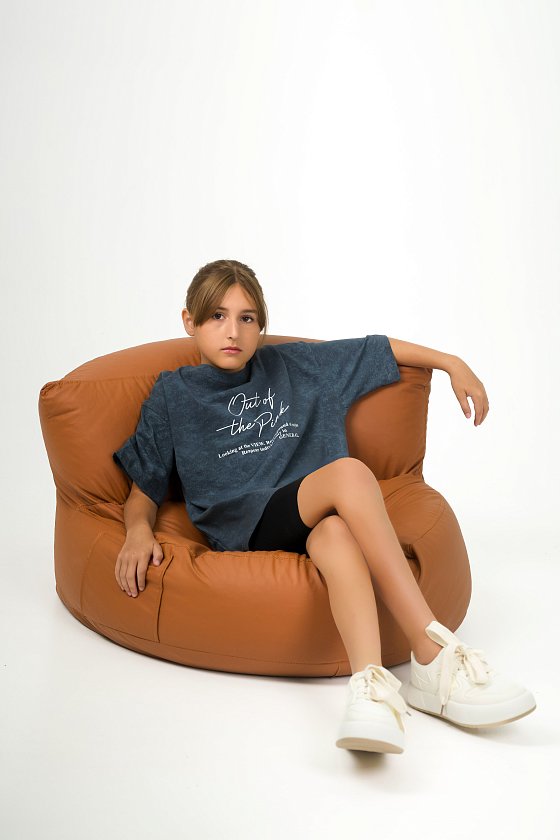 Костюм выполнен из однотонного хлопкового полотна, состоит из футболки свободного силуэта и велосипедок. Футболка с коротким втачным рукавом и принтом спереди. Велосипедки с притачным поясом на резине.